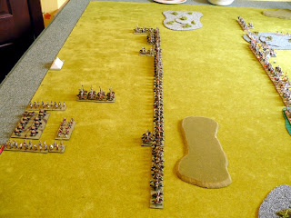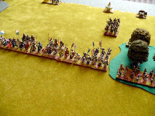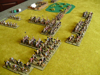 Another game of Dbmm vs Stephen using Turgesh (with Brilliant Su Lu) vs Romanian Franks (with lots of KnS) I was invader in Summer and lots of terrain including a large DH 2 GH 2 SH 1 O & 1 RF. The DH dominated one flank of the Franks the others dotted acroos the tabletop. The Franks advanced their Knights in one solid block which I faced with a mix of LHs and CvO (my Horde and Bow were on camp guarding duties) the Franks had a mixed Cmd of BwO and AxO on my right. I had 4 Cmds 2 with a mix of LHs & CvO 1 with the CIC the foot and 3 CvS, my 4th Cmd was 4 KnX Tibetians (outclassed by KnS). The Frank Knights failed to damage on Cmd of Lh but killed 4 elements of the other in their initial charge punching a large hole in my line which my Tibetians had to plug along with some CvO. Inveitably despite my getting some overlaps the Kn broke this flank completely. On the other flank however I managed to use a GH to shield my Lh & Cv from Bows and I weas able to charge into the Bw/Ax downhill. I managed to kill several but not enough to break the Cmd and after a loss to bow fire I placed my SG into line for a new charge but a single Bw element killed him (6 -1 on dice) !!!! breaking that Cmd and losing me the game............again..................