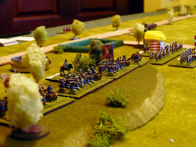 I had great terrain (big hill centrally) upon which I deployed 2 ArtO in breastworks flanked by Pk/Sh with Pistols & LH on wings...........................BUT......................through a very specific combo of dice rolls Stephen was able to conduct a night attack on my static force. He had 6 turnns of fast moves during Dusk followed by 30+ moves at night.