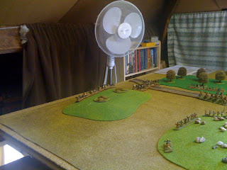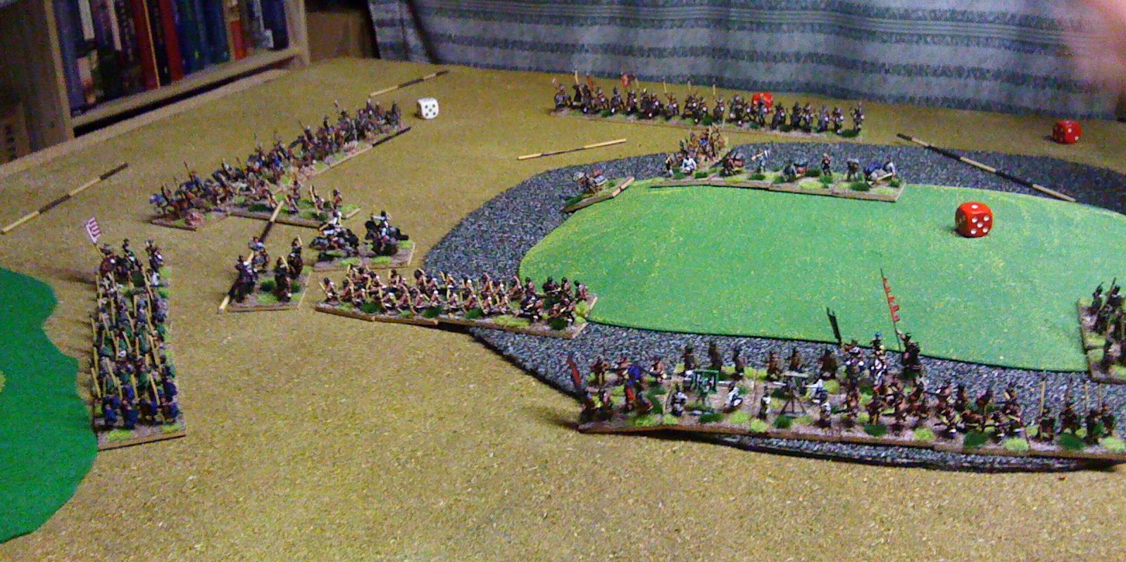 Han deployed first on the hill. I sent my Kang-Chu ally on outflank on my left (having suffered from unreliable ally last game I was wary of keeping on table). I then deployed mainly to my right hoping to envelope Han left.