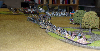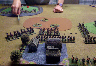Meanwhile the Han advanced off their hill against my screen central Cmd whilst my envelopment was attempted. As usual the ArtO managed a couple of kills and more importantly forced a couple of columns of LhF to Flee (I had not realised a whole column would flee with front rank element). Annoying as I neeeded to get into posistion and deploy quickly.
