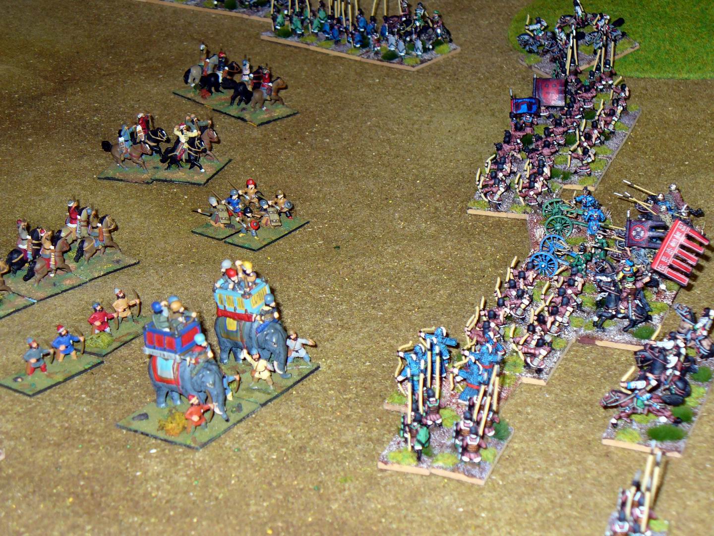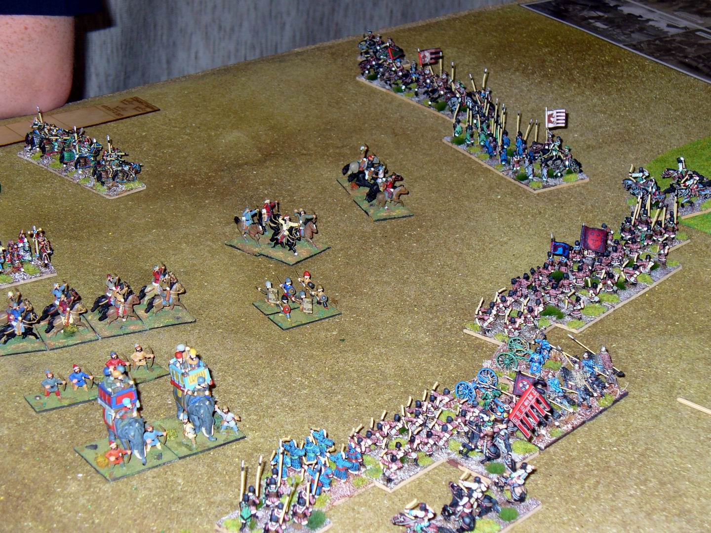 Things did not auger well when set-up forced me to deploy first but move second due to Han gaining a night attack (albeit moonless with only 80p moves). I deployed fairly compactly and did use Scouting successfully which (theoretically) allowed me to move at night as well. HOWEVER.......... Ally of course went unreliable and my Pips where truly awful throughout the seemingly endless night. Han had cunningly set up massed against my left flank and had great night-time Pips allowing them to get right into face of my virtually immobile flank (try wheeling/moving inept troops at night at 80p with rolls of 1 or 2 !). Of course Elephants watched sun come up and enemy bolt-shooters letting loose. 'Ally' staunchly refused to answer my CiCs call (12 Pips wasted in course of game trying to get the sod into action).