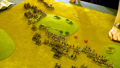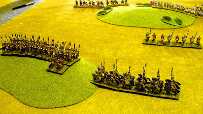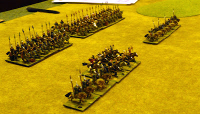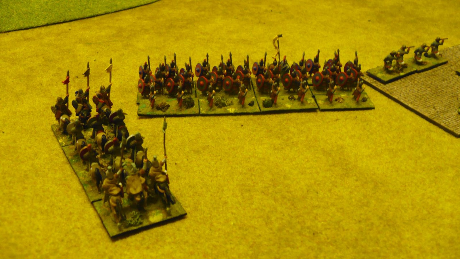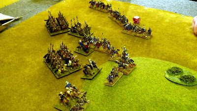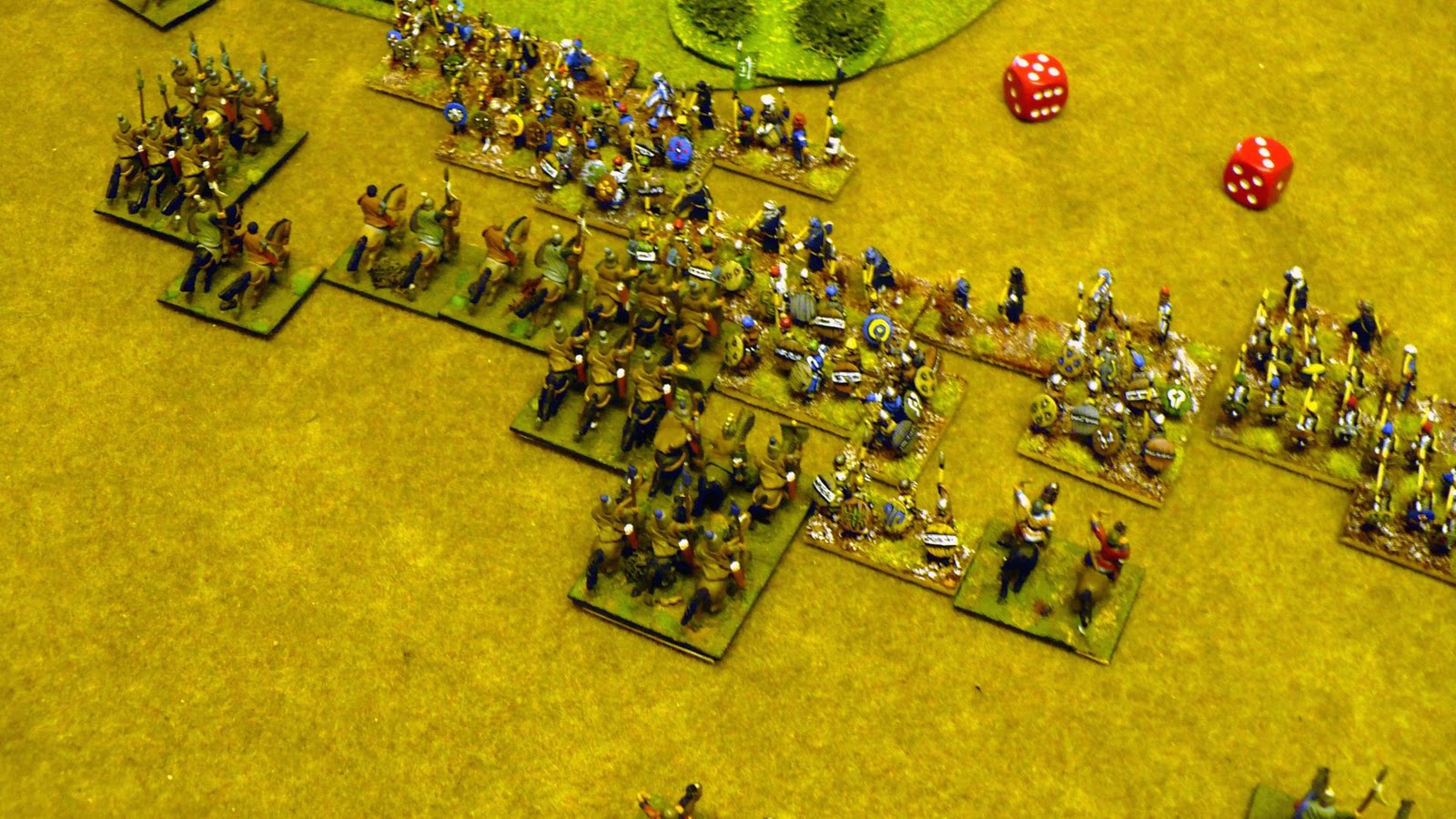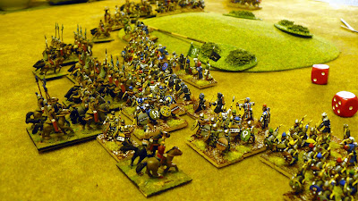 Another Dbmm game played on Friday evening versus Stephen. As change from endless Munster practice games we decided to try a couple of different armies. I took the Maurikian Byzantines and Stephen a Buyid army. Another very good and enjoyable game with the compact Byzantines against a really large Buyid array. I sent a small Arab Nomad command on a flanking march and again it arrived at first opportunity (this is getting to be a habit !) However this time it worked ok as my double based Kavallorii were able to get into support quickly. I held up the massed Buyid auxilla foot in centre (on and between 2 SH as usual) with mainly Lh and my Skutatoi defended my right anchored on a BUA (I really must get some period buildings). A push and shove battle all along the line with neither of us gaining any clear advantage. In fact this turned into the least bloody game of Dbmm I have played. I lost 8 elements and Stephen only 8 !! Amazingly only one 6:1 in whole game and that non crucial. We both seemed to consistently roll high or low together. In points terms it ended as a 13:12 result in Buyids favour only by virtue of them being invaders however with a few more turns (at 0045hrs we called it), my Nomads would most likely have broken (lucky not to in last turn surviving three hard flanked combats !!) and having nothing left to fill gap would have allowed superior Buyid numbers to tell I suspect.