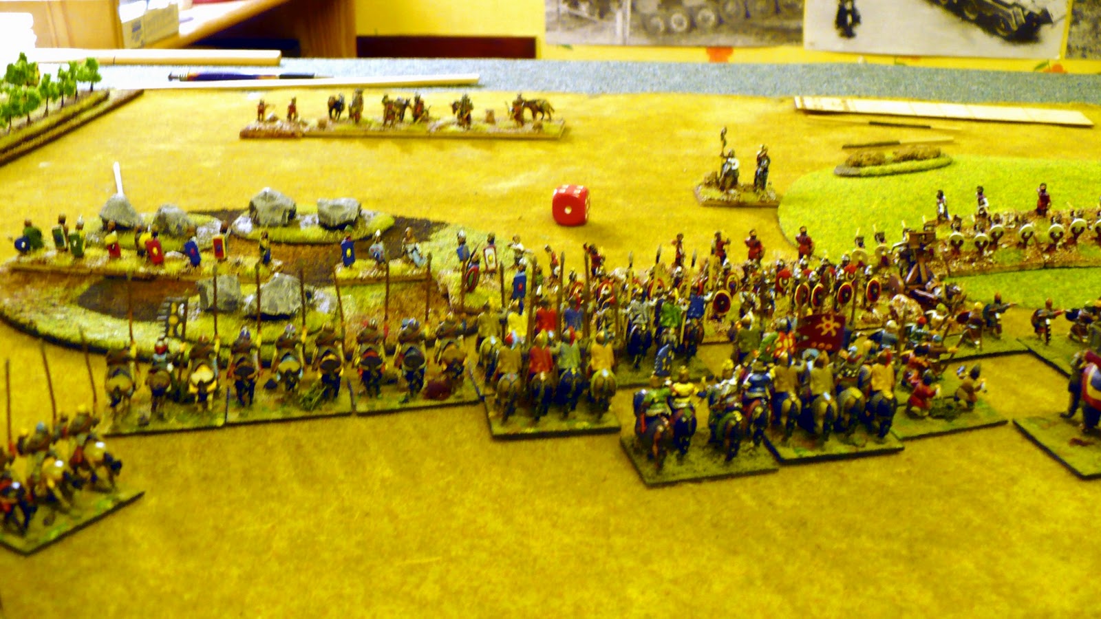 Played Dbmm game last night versus Stephen. He wanted to try Late/Patrician Roman army so I picked a contemporary the Sassanid Persians. I used early version (ie 220-493AD) with 5 KnX Cataphracts usual horde of 15 CvS 2 ElO, 6 AxS ,7 PsO, 9 HdO, 8 LhF, 6 Bg and a Nomad ally of Lh Ally General 4 LhO & 1 LhI. Patricians fielded lots of Hun LhS (several subject elements plus an Allied command) with 1 ArtO, couple of rLhO, 6 BdO and lots of Irr & Reg AxS backed by PsO and a few compulsory rCvO. With 0 aggression the Romans are pretty likely to defend (as indeed they did) and are therefore also highly likely to be able to build a 'terrain fort' which is exactly what happened (as pics show below) with 2 Rough Hills a Rocky field and the 'gifts' (from my selections) of a vineyard and a difficult hill. We both discussed how in a competition setting a Cavalry type opponent like Sassanids would most likely not advance on such a position and Romans correspondingly unlikely to leave their hills to advance onto a plain in face of cavalry so a form of draw probable. But me being me I of course decided to go for it :-)