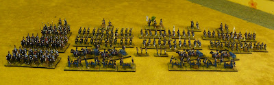 Someone (the fool !) asked for a progress picture so here is initial army nearly completed. I now have enough done for Army Builder defensive core plus one option (the Cuirassier) with just 2 more Infantry Battalions to allow attack option.