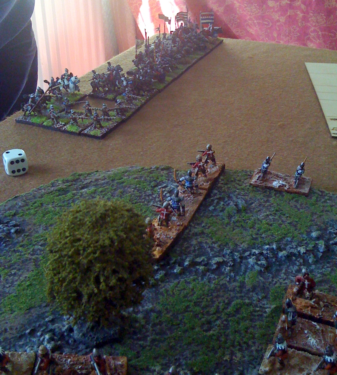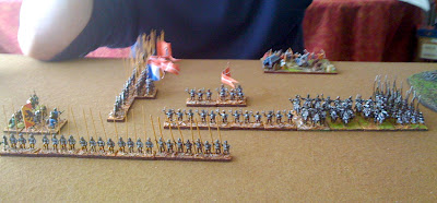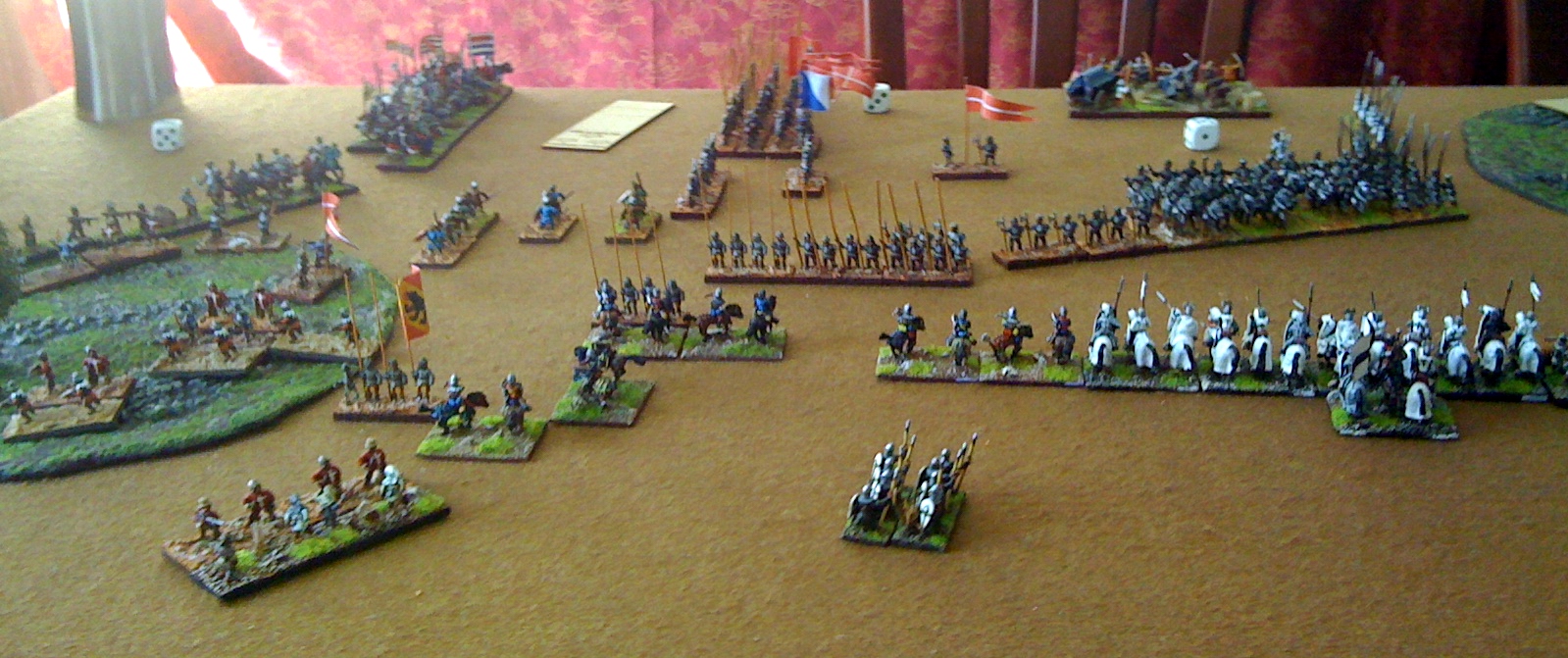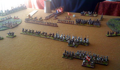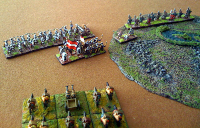 So....... I decided to take large risk and send one of my three commands (with the three Kn wedges) on an outflank on my left (in behind one wood) whilst remaining two commands went up the middle.