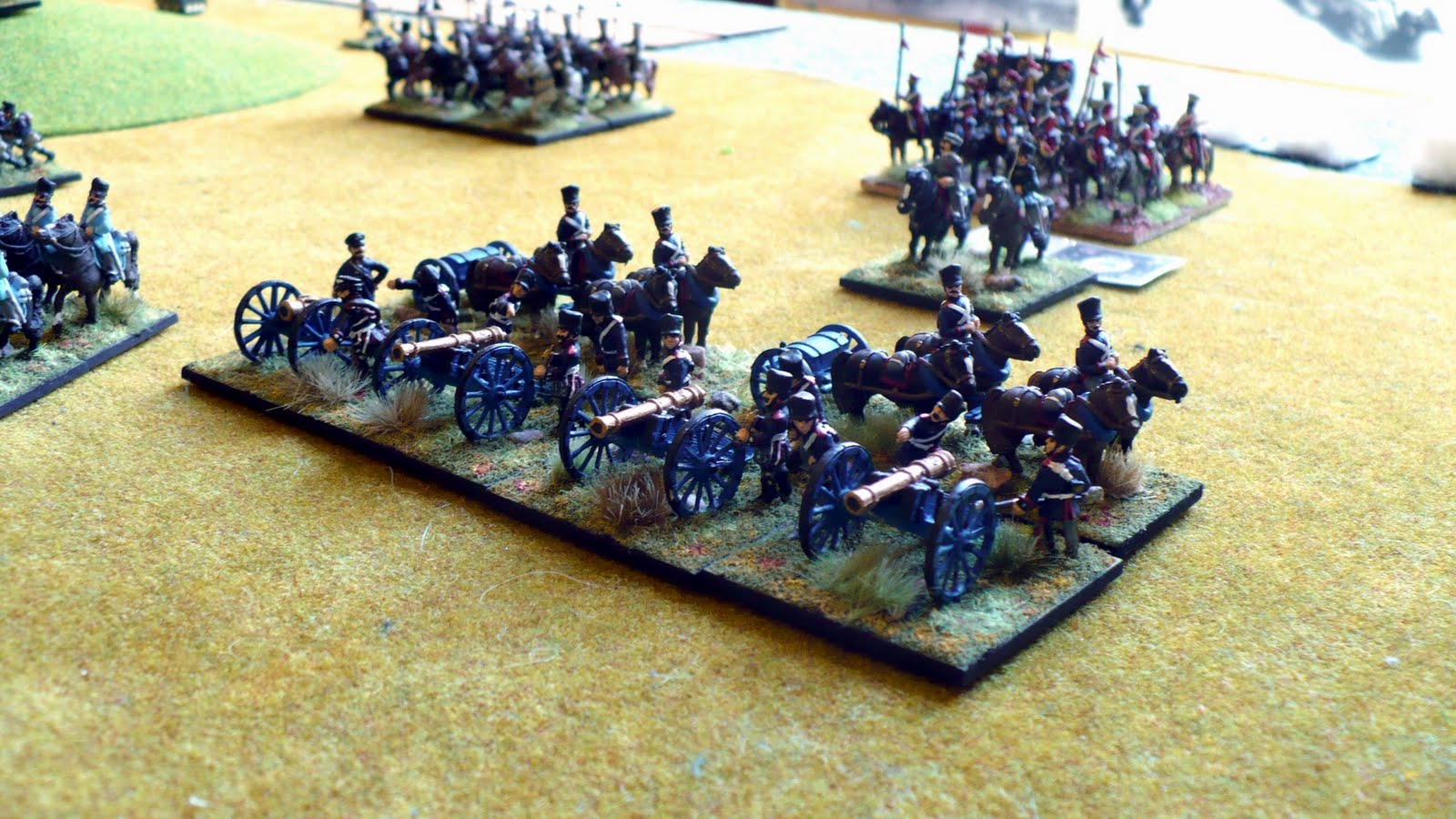 Prussian center suffers disruptions from French artillery (Prussian battery already destroyed)
