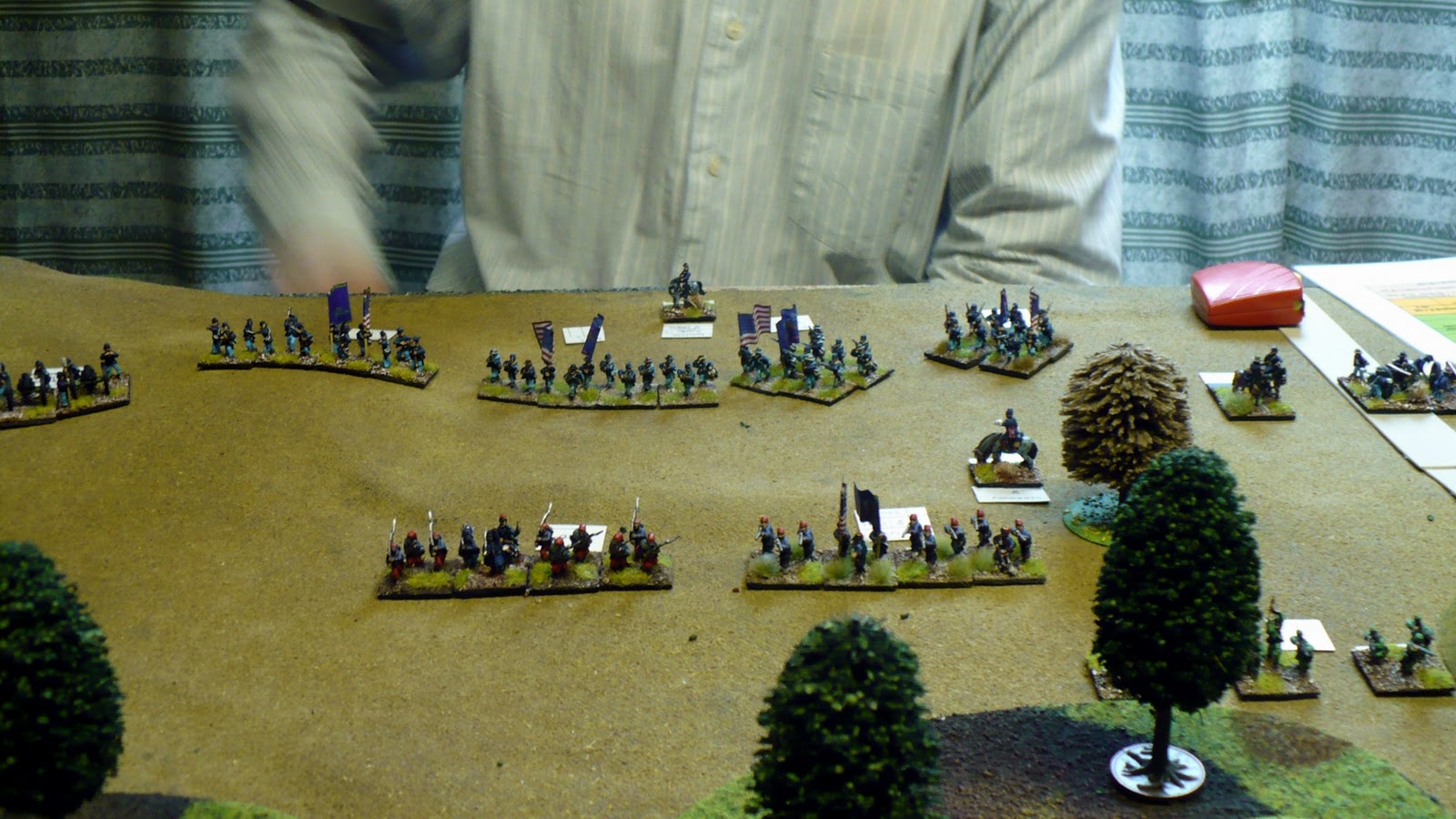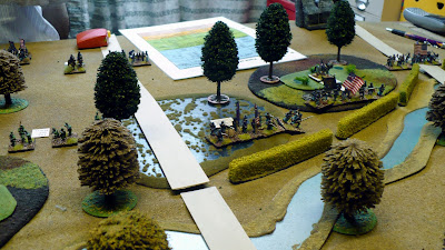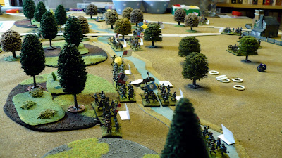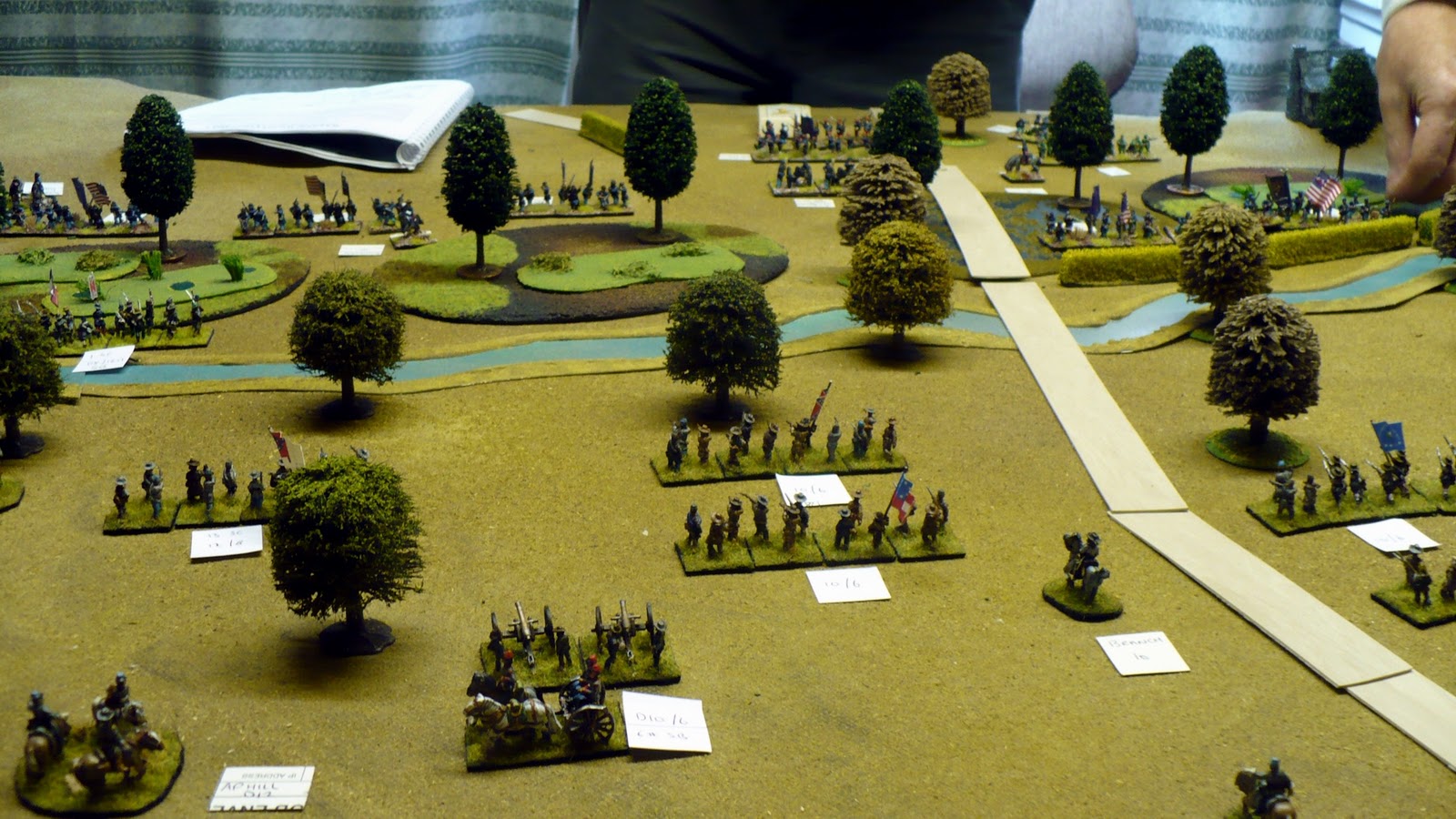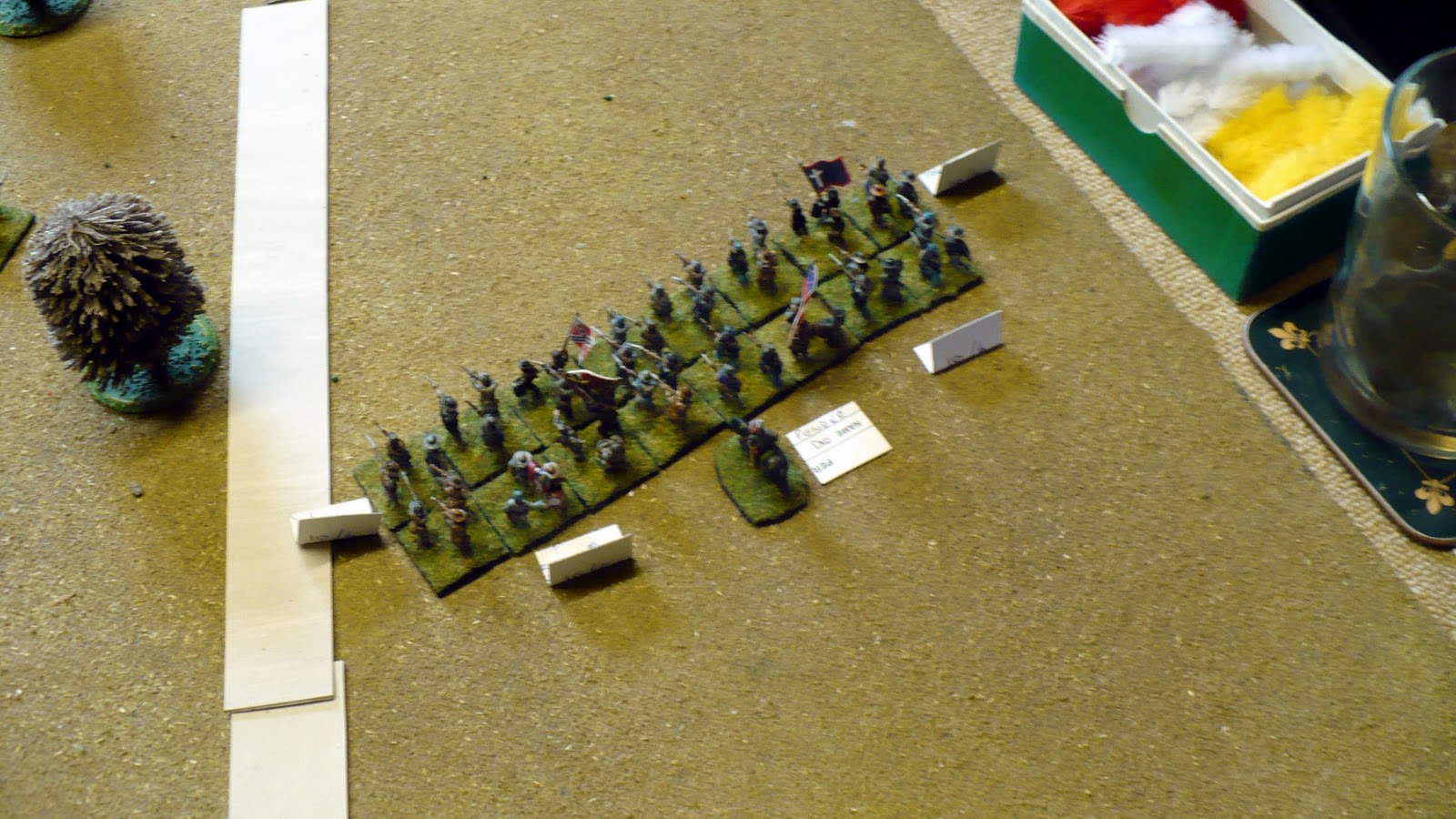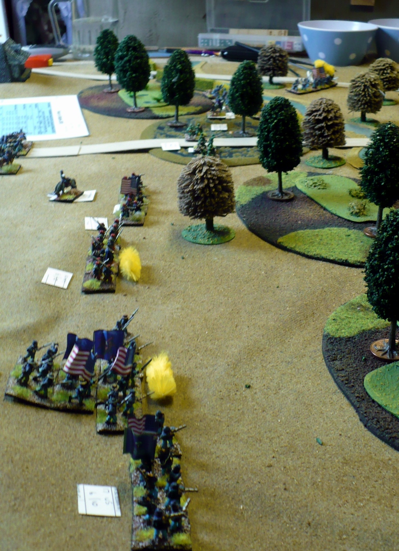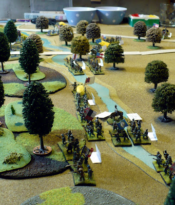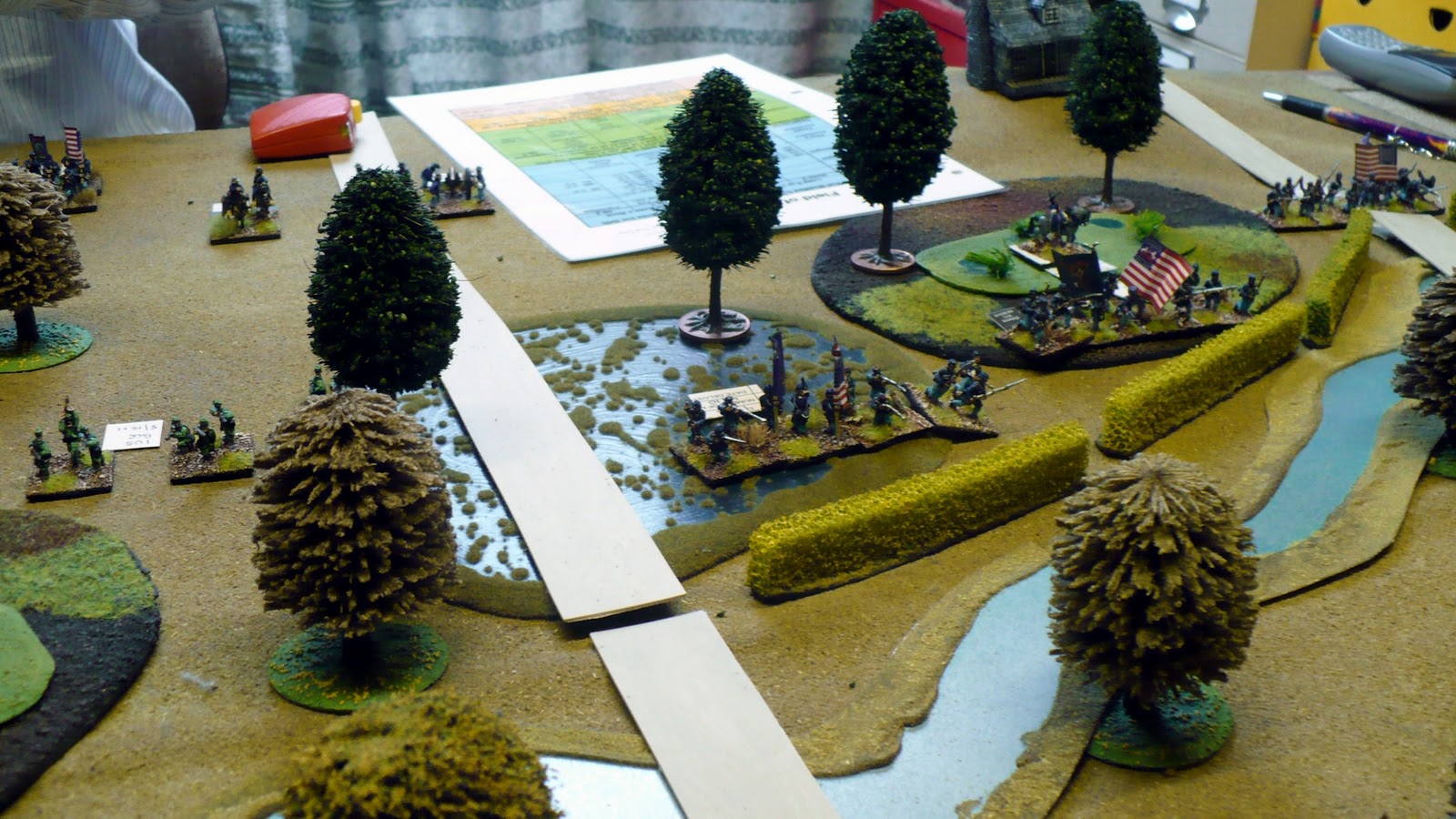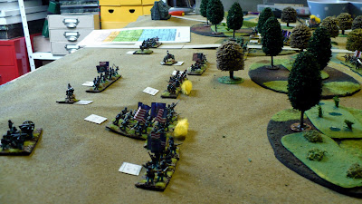 Game was based around a Guns Of Gettysburg scenario (Pine Oaks 1862 I think ?) with yours truly set up in defence with a single Brigade of Union regulars on table and John as Rebs attacking. Rebs were slowed by lots of woods but the aforementioned aggressive Veteran unit charged a Union Regt in Adams Farm (soft cover from surrounding fence) and managed to Rout it which caused supporting unit to rear to be routed in burst through and flank support to fall back (both routers were later rallied but took no further part in game as such). Union reinforcements (a further 3 Brigades arriving on successive turns) arrived quickly as we only had a single 'Coffee Break' card in deck initially (we later added a second to extend turns). Union Brigadier Crouch was rated as Inspirational and upon turn of an Inspired Cmdr card he was able inflict revenge upon the Rebs by adding +2 to a charge by one of his Regiments (equivalent for one turn to aggressive charge) which routed a Reb Regt and its rear support. On Union left a Brigade deployed to fend off an arriving Reb brigade and the Union artillery unit with this brigade used aimed fire (2 command Pips to direct fire) to decimate Rebs forcing them to withdraw. Union center was shored up by a Veteran Brigade which deployed behind the Farm then went onto attack orders to try to re-occupy the dwelling. They dealt heavily with the aggressive Reb unit (Texans I think ?) which had become isolated due to their forging ahead alone in Union positions (aggressive troops are forced to charge when within 8" of enemy if under attack orders). On Union right a struggle in the heavy wooded area was taking place with several close combats and fall backs with units on both sides bloodied and with shaky morale (Fightin' and Defeated modes in rules). We had to call time at this point with things very much in balance. Next game with rules (although Le Feu Sacre by TFL as real possibility for next outing) will be smoother and quicker as we now know the quirks of the system and will likely spend much less time discussing rules and indeed what we intend to purchase at Warfare next month !!!
