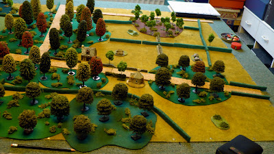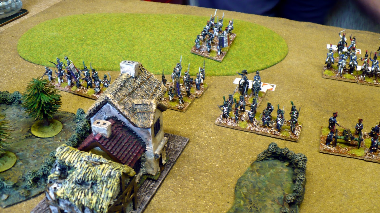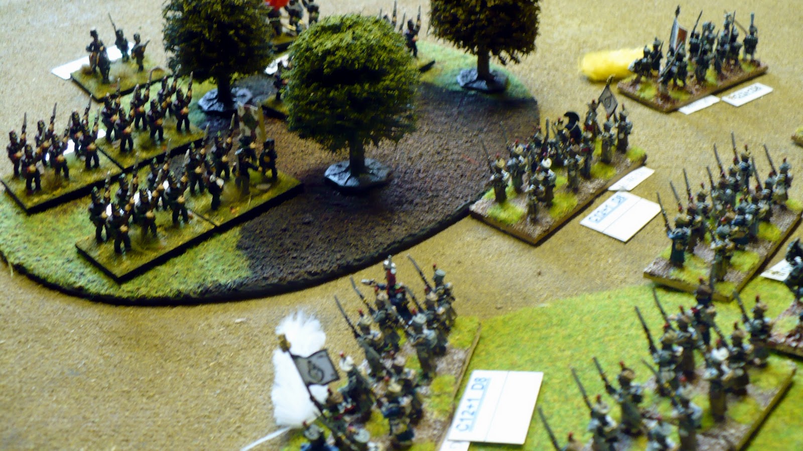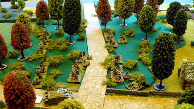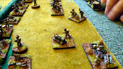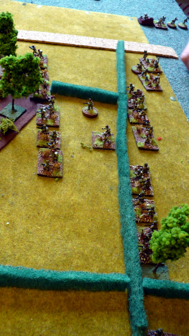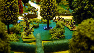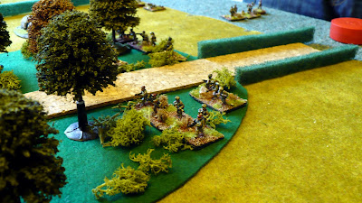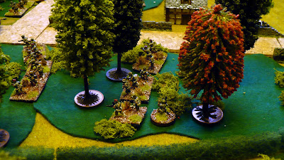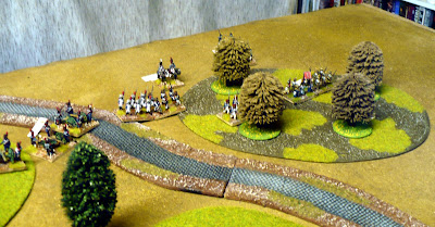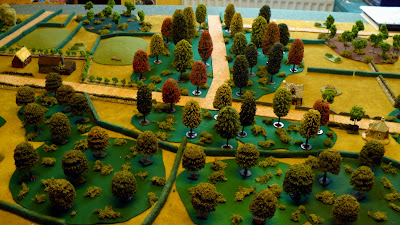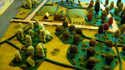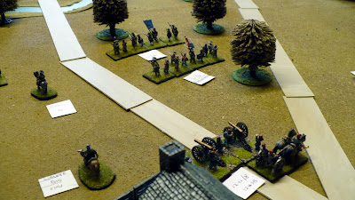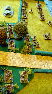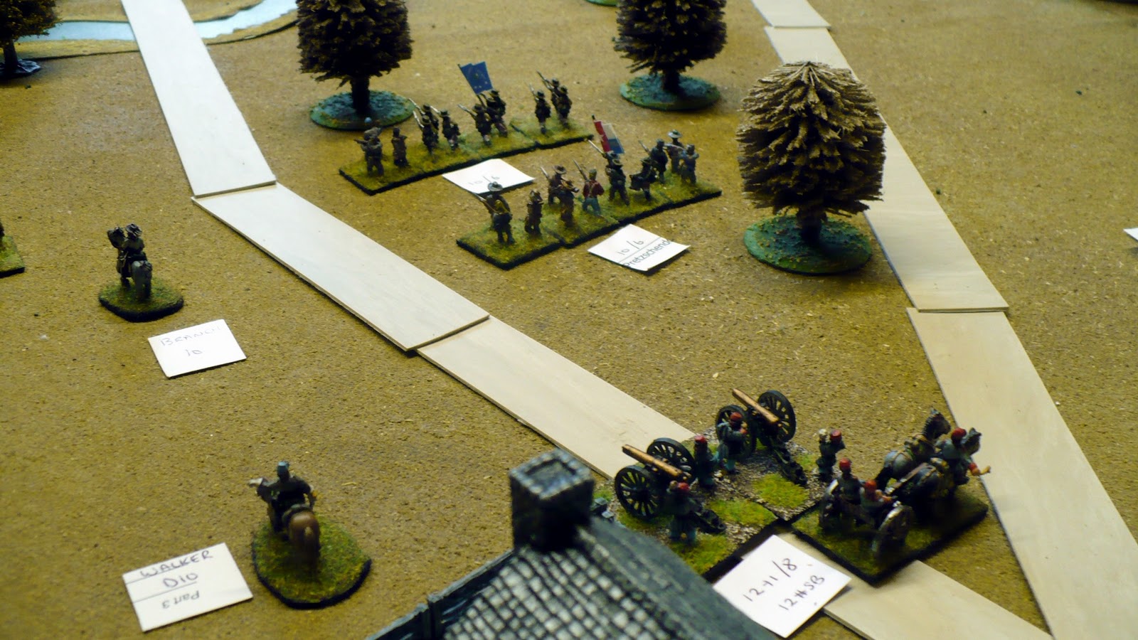 Game was based around a Guns Of Gettysburg scenario (Pine Oaks 1862 I think ?) with yours truly set up in defence with a single Brigade of Union regulars on table and John as Rebs attacking. Rebs were slowed by lots of woods but the aforementioned aggressive Veteran unit charged a Union Regt in Adams Farm (soft cover from surrounding fence) and managed to Rout it which caused supporting unit to rear to be routed in burst through and flank support to fall back (both routers were later rallied but took no further part in game as such). Union reinforcements (a further 3 Brigades arriving on successive turns) arrived quickly as we only had a single 'Coffee Break' card in deck initially (we later added a second to extend turns). Union Brigadier Crouch was rated as Inspirational and upon turn of an Inspired Cmdr card he was able inflict revenge upon the Rebs by adding +2 to a charge by one of his Regiments (equivalent for one turn to aggressive charge) which routed a Reb Regt and its rear support. On Union left a Brigade deployed to fend off an arriving Reb brigade and the Union artillery unit with this brigade used aimed fire (2 command Pips to direct fire) to decimate Rebs forcing them to withdraw. Union center was shored up by a Veteran Brigade which deployed behind the Farm then went onto attack orders to try to re-occupy the dwelling. They dealt heavily with the aggressive Reb unit (Texans I think ?) which had become isolated due to their forging ahead alone in Union positions (aggressive troops are forced to charge when within 8" of enemy if under attack orders). On Union right a struggle in the heavy wooded area was taking place with several close combats and fall backs with units on both sides bloodied and with shaky morale (Fightin' and Defeated modes in rules). We had to call time at this point with things very much in balance. Next game with rules (although Le Feu Sacre by TFL as real possibility for next outing) will be smoother and quicker as we now know the quirks of the system and will likely spend much less time discussing rules and indeed what we intend to purchase at Warfare next month !!!
