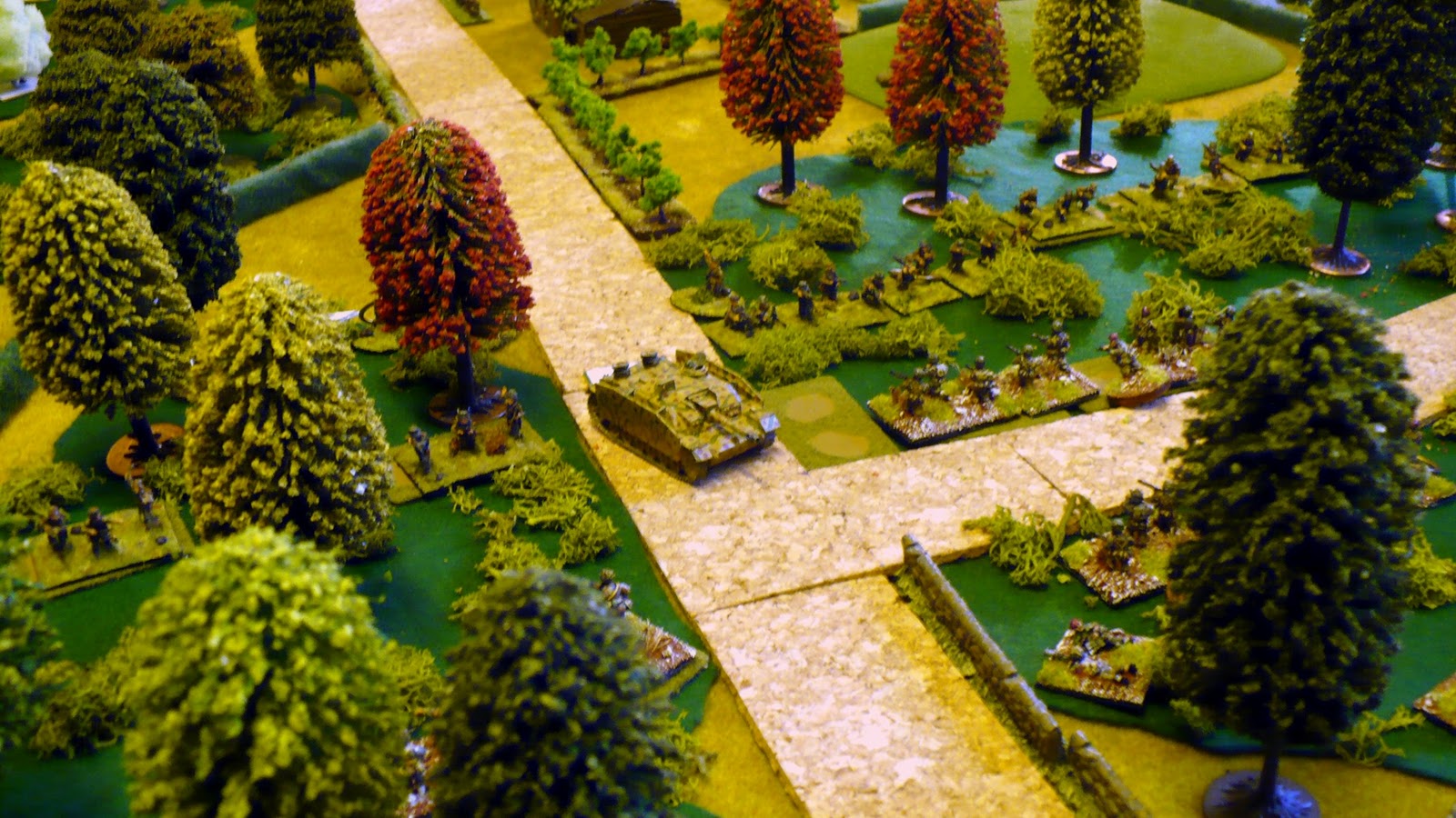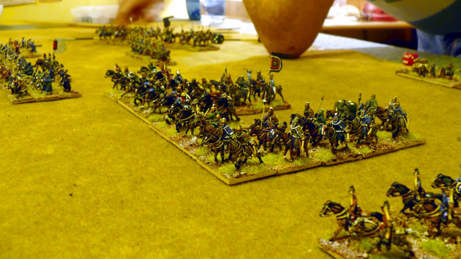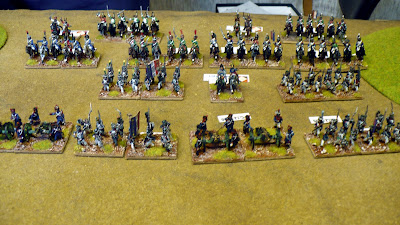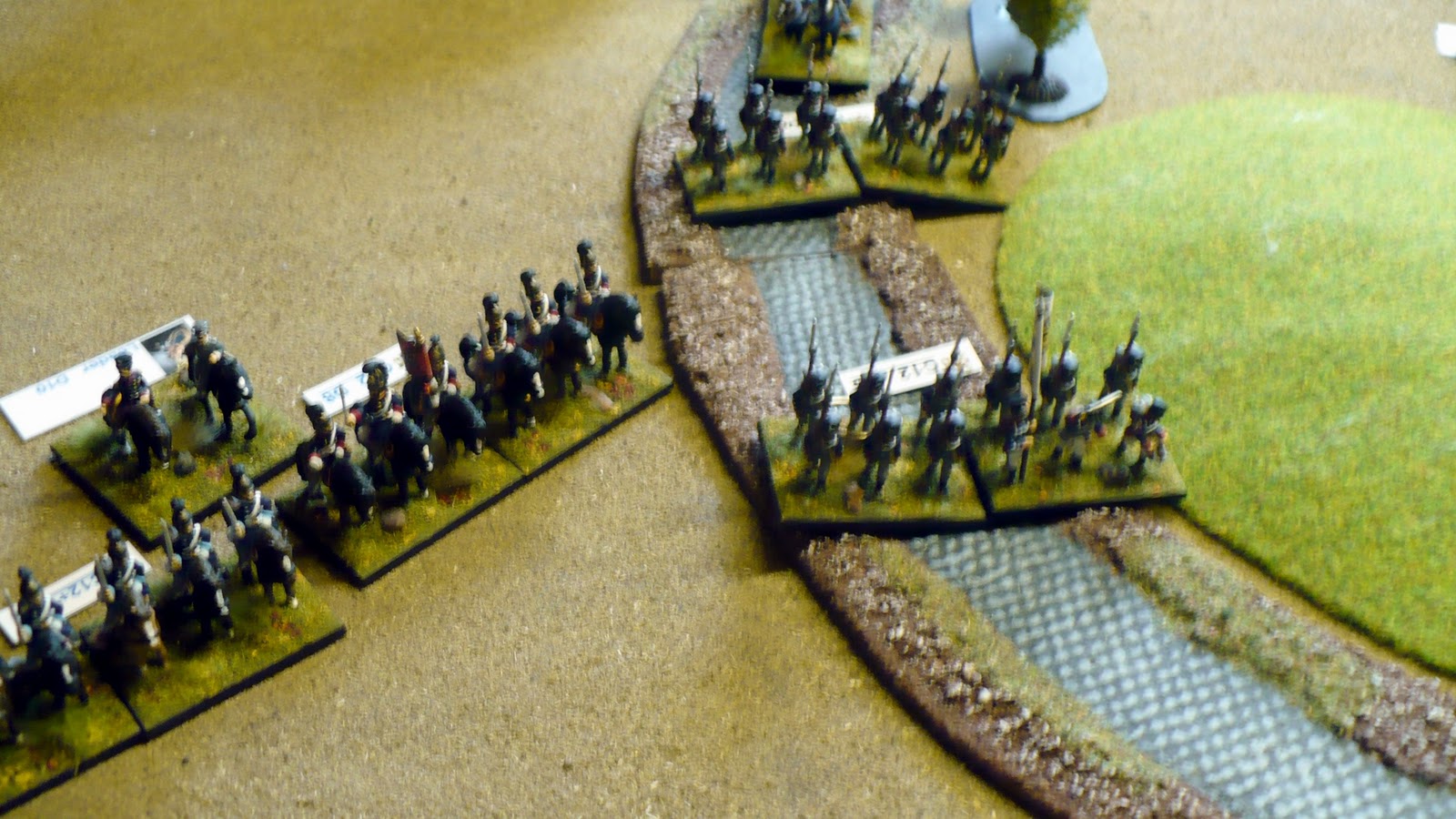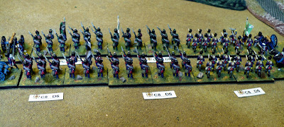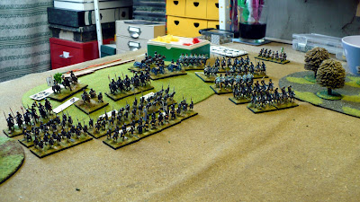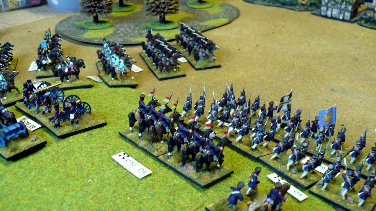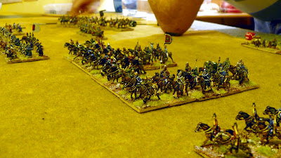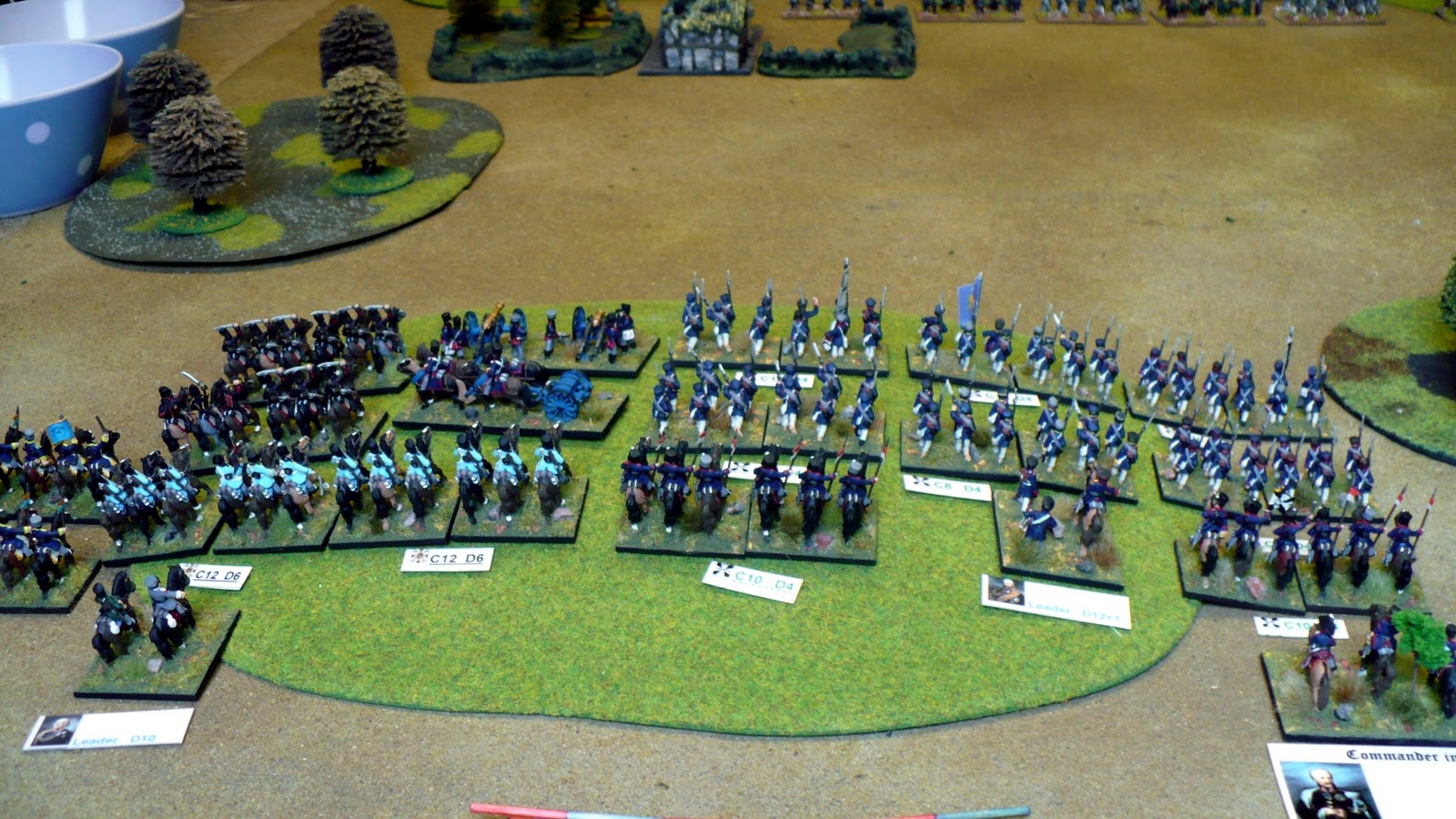 Game was based around a Guns Of Gettysburg scenario (Pine Oaks 1862 I think ?) with yours truly set up in defence with a single Brigade of Union regulars on table and John as Rebs attacking. Rebs were slowed by lots of woods but the aforementioned aggressive Veteran unit charged a Union Regt in Adams Farm (soft cover from surrounding fence) and managed to Rout it which caused supporting unit to rear to be routed in burst through and flank support to fall back (both routers were later rallied but took no further part in game as such). Union reinforcements (a further 3 Brigades arriving on successive turns) arrived quickly as we only had a single 'Coffee Break' card in deck initially (we later added a second to extend turns). Union Brigadier Crouch was rated as Inspirational and upon turn of an Inspired Cmdr card he was able inflict revenge upon the Rebs by adding +2 to a charge by one of his Regiments (equivalent for one turn to aggressive charge) which routed a Reb Regt and its rear support. On Union left a Brigade deployed to fend off an arriving Reb brigade and the Union artillery unit with this brigade used aimed fire (2 command Pips to direct fire) to decimate Rebs forcing them to withdraw. Union center was shored up by a Veteran Brigade which deployed behind the Farm then went onto attack orders to try to re-occupy the dwelling. They dealt heavily with the aggressive Reb unit (Texans I think ?) which had become isolated due to their forging ahead alone in Union positions (aggressive troops are forced to charge when within 8" of enemy if under attack orders). On Union right a struggle in the heavy wooded area was taking place with several close combats and fall backs with units on both sides bloodied and with shaky morale (Fightin' and Defeated modes in rules). We had to call time at this point with things very much in balance. Next game with rules (although Le Feu Sacre by TFL as real possibility for next outing) will be smoother and quicker as we now know the quirks of the system and will likely spend much less time discussing rules and indeed what we intend to purchase at Warfare next month !!!