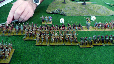 Tim managed to set up his Legionaries on a central hill along with his Artillery and I thought my lot will have a torrid time attacking that (retreat or inaction not an option) but to his infinite and undying credit the Madeley chap advanced even coming off his hill 'fort'being a man after my own heart !