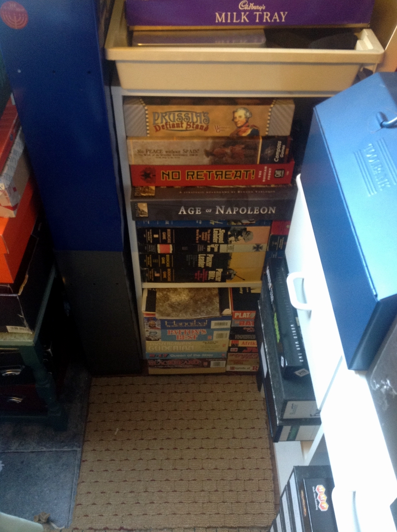 Few pics (playing with new iPad toy) of my games room which with the 7ft x 5ft table I managed to squeeze in is somewhat bunged to its qills with wargaming 'pruc' (better half does not mind the wargaming as long as it stays in one room).