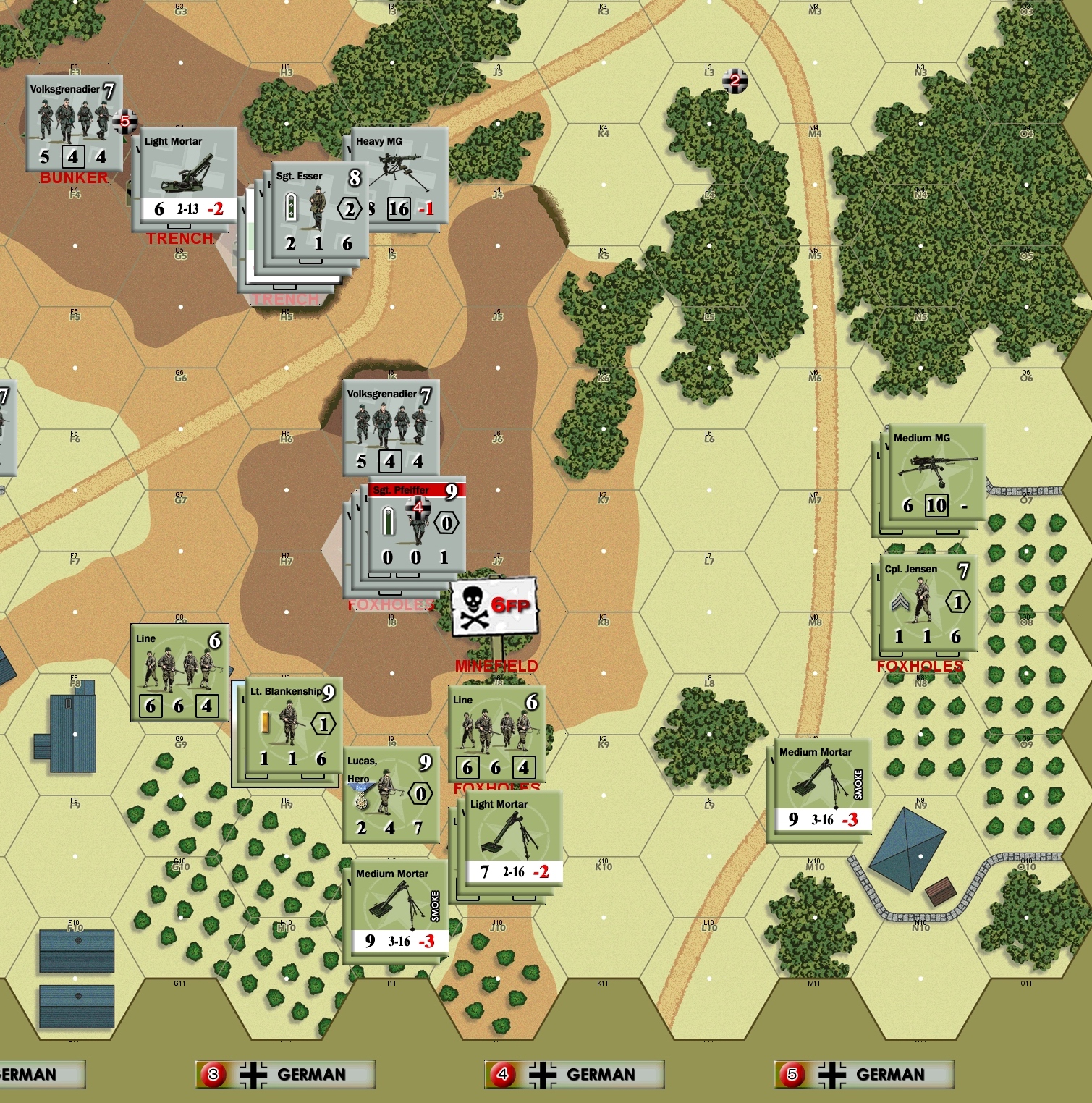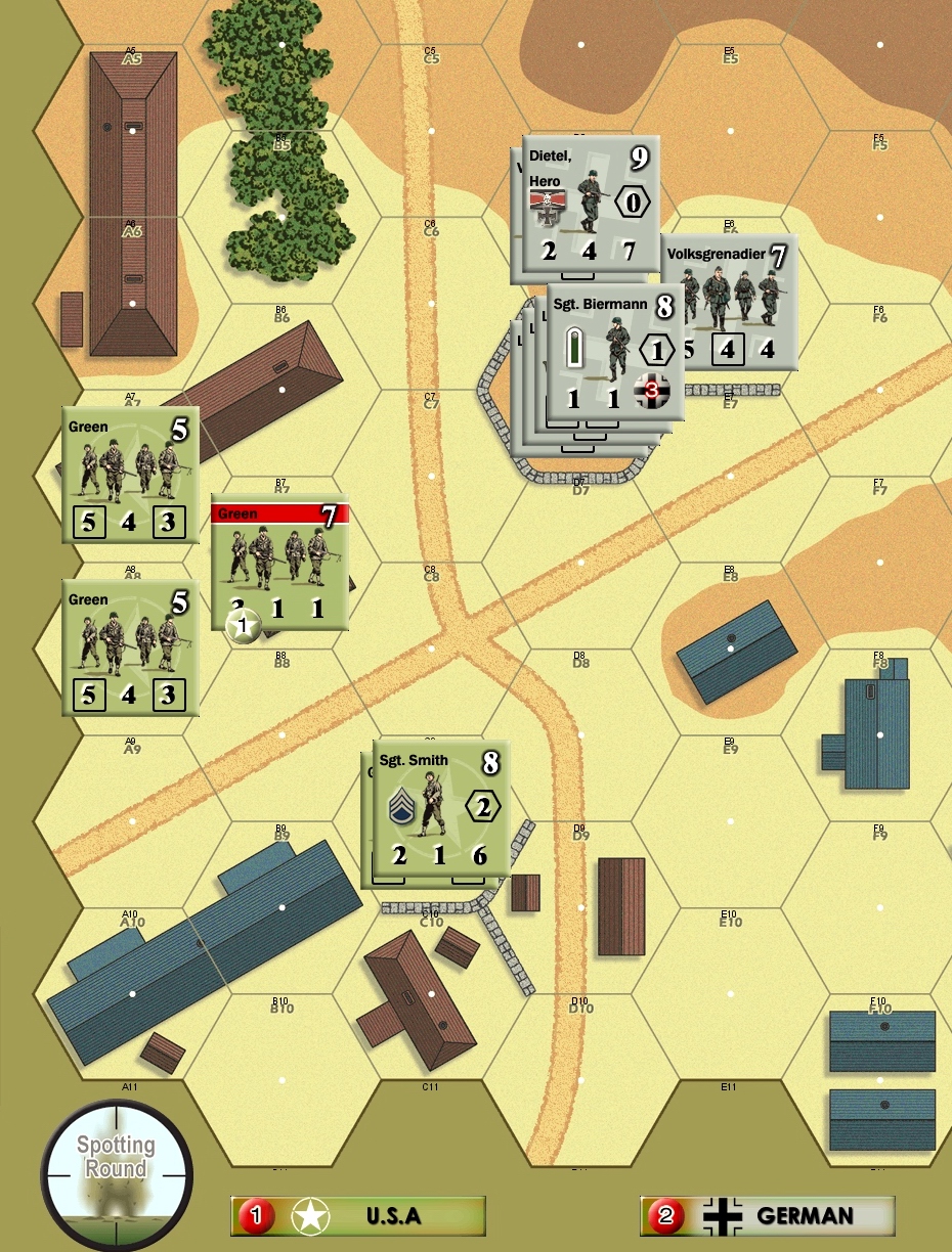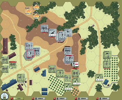 The key VP location 5 building was solidly held by Fritzs and I could make no headway gaining only one hex with hero and a squad.