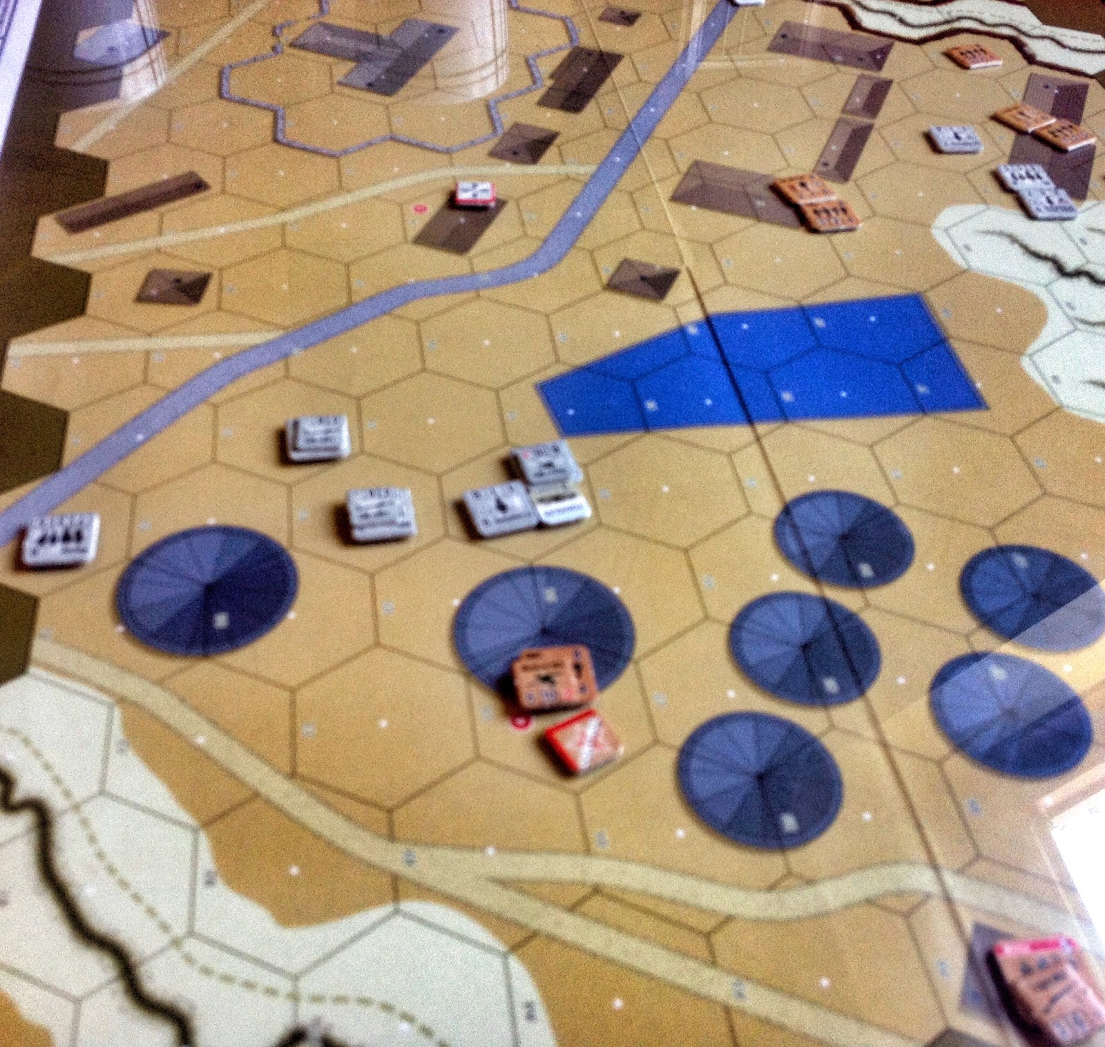 First scenario was from the Normandy pack with an action set on Sword Beach with me as British invader against German beach defenders. AS can be seen from pics below I had a large strech of beach to traverse to get to cover of a line of Shingle with only few hedgehogs defences to assist. Moving in sand/beach hex costs extra half movement point. The Germans have a Gun in a bunker but with fixed firing line several wire entanglement and couple of other Bunkers all connected by communication trenches (give good cover of +4). British troops a mixed bunch but they do have scenario specific ability to always discard one card even if other orders/actions taken. But by far the biggest influence in our game was pre-game smoke bombardment which puts random smoke into 10 (I think) random hexes after set-up of both sides. Thankfully for me the smoke fell very kindly effectively masking of my approach of left hand side of beach. This let me move virtually unmolested up to the left most Bunker (and the one containg the fixed gun) which soon fell to a close assault. I was then able to mass against rest of Germans and mop them up for possibly easiest win yet. Of course could have been much different of smoke not so fortutitous in its placement or if a Breeze event had occurred. One up then to the offspring.