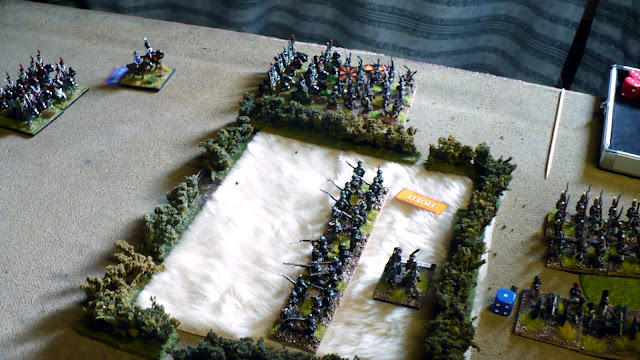 The Duc realising that his Light Cavalry Corps on my right was facing 'prepared' Infantry, sent this force through a wooded area in an effort to outflank my line.