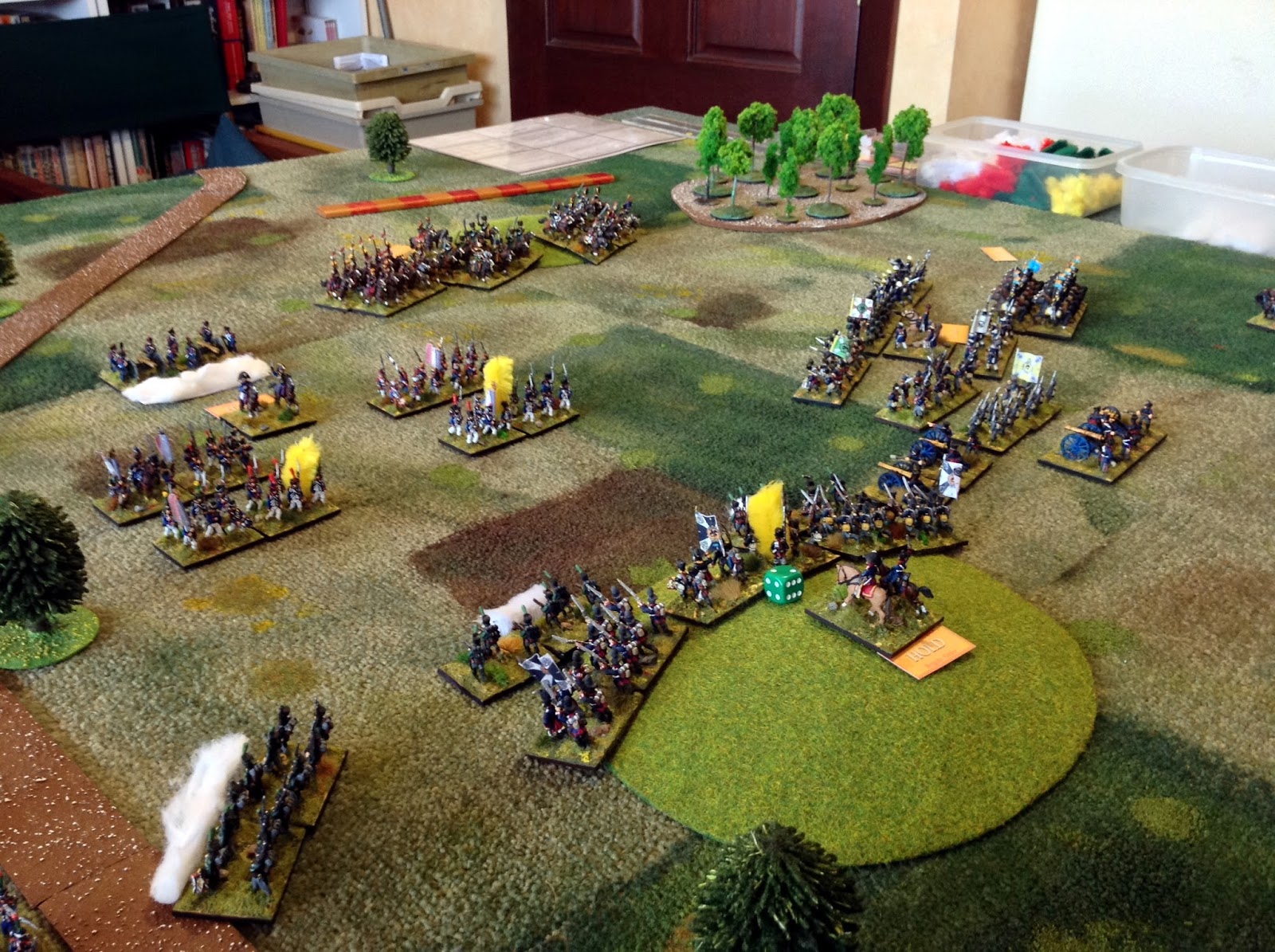 Overview of table with French Guard Cavalry Division stuck in Reserve mode as 2 of the ADC I sent with orders to attack failed to reach them (third seen approaching them)