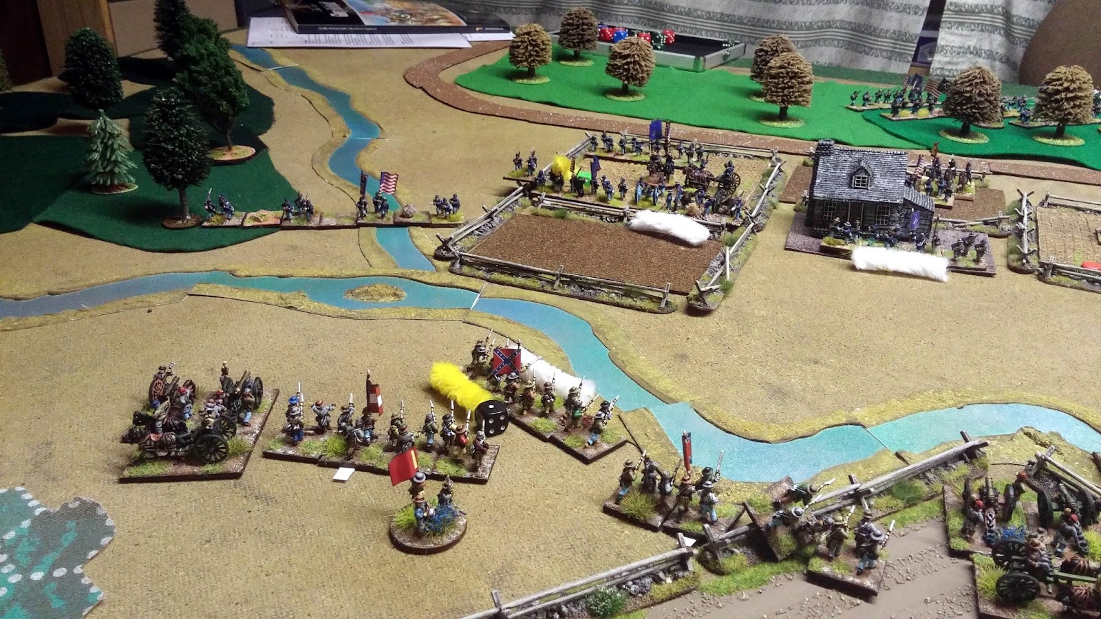 The river slowed the Rebs allowing the Yanks to get their Reserve Brigades on table and into the line.