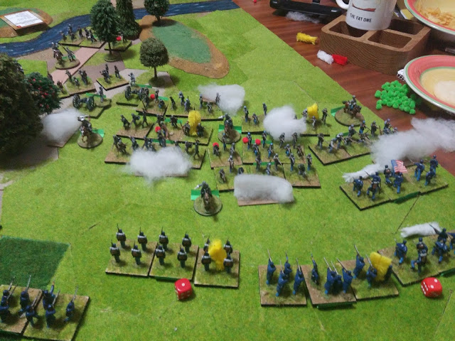 Rebels had a Skilled deck and some Elite units and decent leaders (mostly D10) and a line of entrenchments against my more numerous Yanks but saddled with a Poor deck and mediocre units and leaders (a lot of D8).