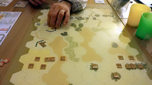 With Frontal Assault French got 3 turns of Bombardment which I managed to mitigate somewhat with extended lines and hiding behind central large hill.