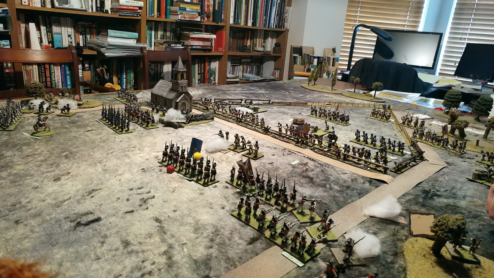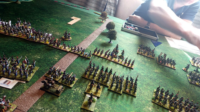 I fielded Russians with 3 Infantry and two (poor) Cavalry Brigades backed by 1 heavy and 1 medium battery of guns with two small Cossack units (24 units).