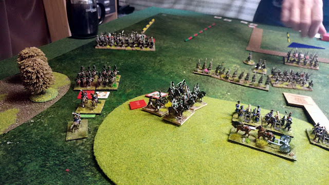 First melee had 6 dice each needing 4's and we both rolled 4 hits so both Wavered (he would then retire) second melee same (but both included our Divisional Generals) we both rolled 5 hits each for same result (note no melees actually won by me).