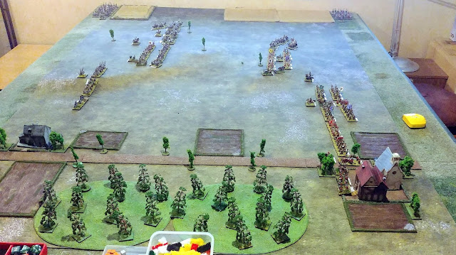 Both sides could deploy into 3 extra table squares and Prussians could remove 1 terrain feature (they chose to remove a large wood on central hill mass.