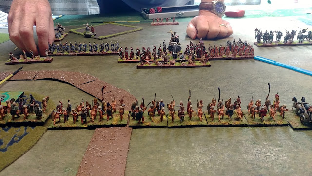 However it turned out to be a complete slaughter of the Gauls by the tough Roman Legionaries especially 5 Elite types backed by an Elephant which are hard for my 'Irregular' types to avoid (Romans won initiative and attacked).