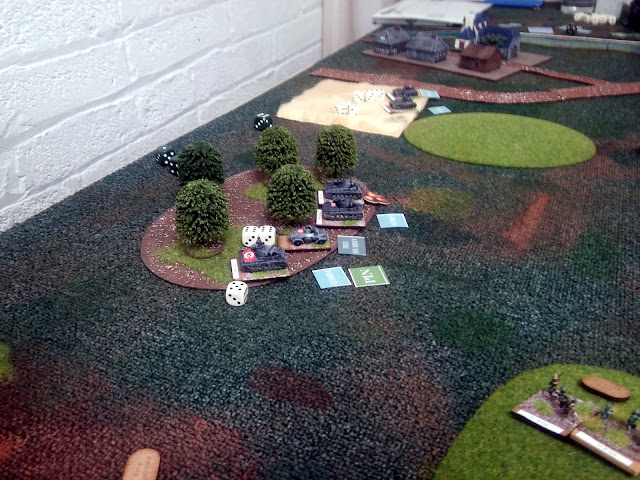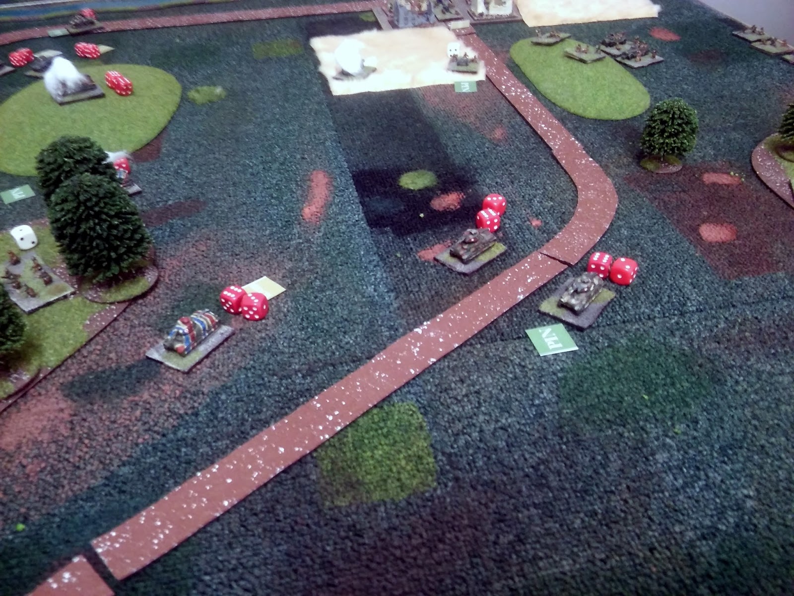 Armour battle proved fairly bloodless with only a single Sherman brewed and no Stugs lost as both sides reluctant to close range and so most shots requiring 6 to hit then 8 or 9+ to kill.