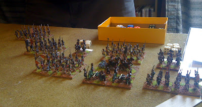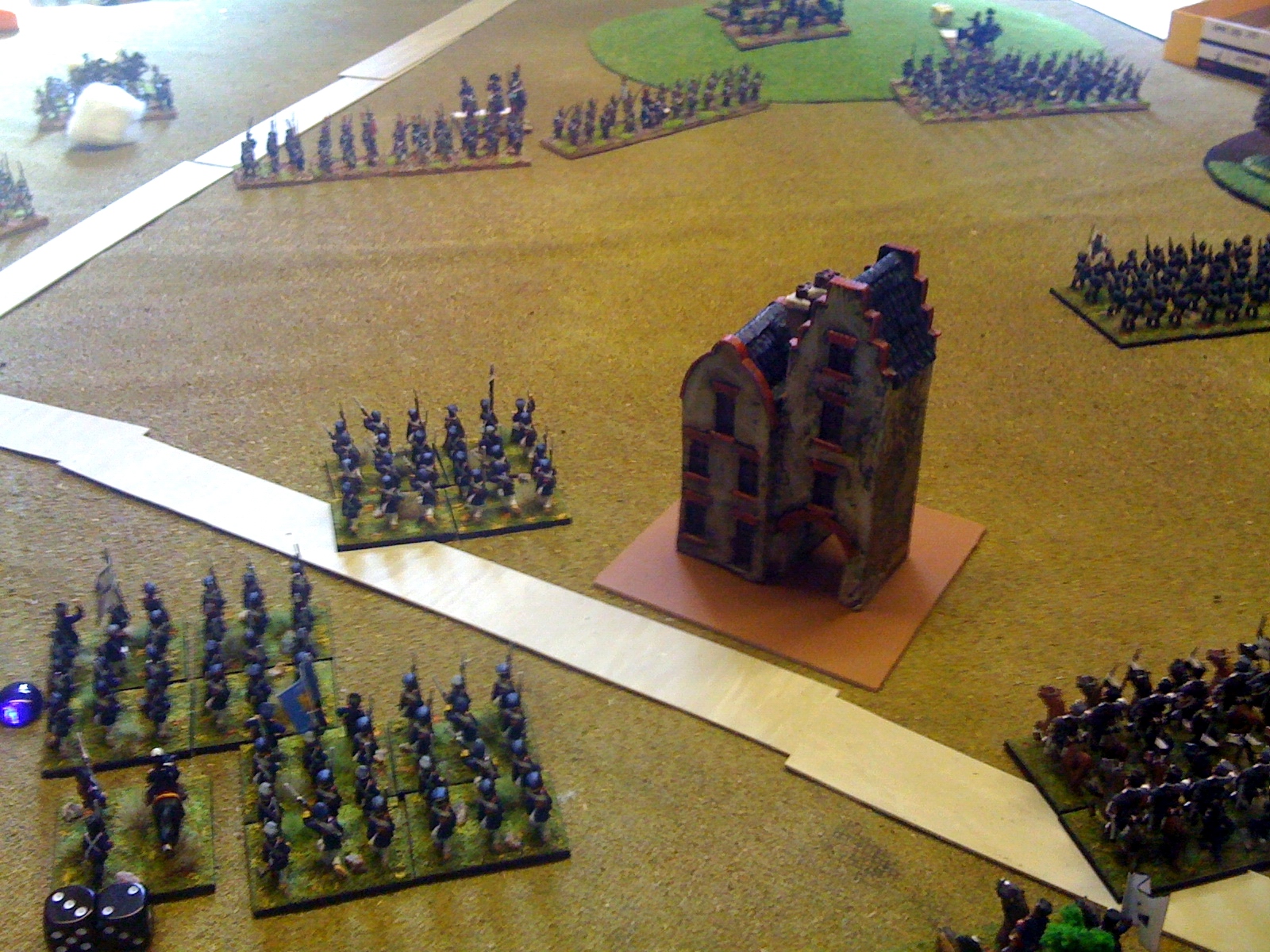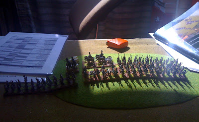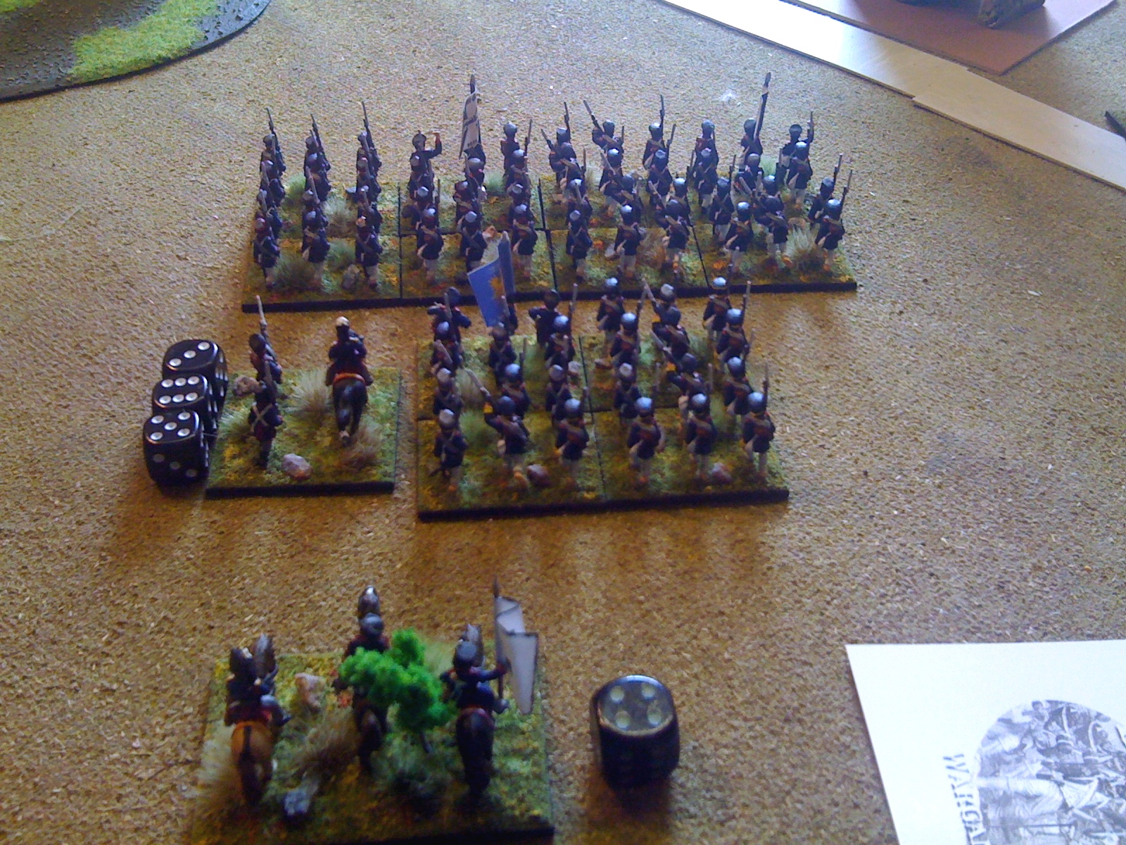 French left flank basking in sunlight (Napoleonic period specific 'template' visible on left and rulebook on right)