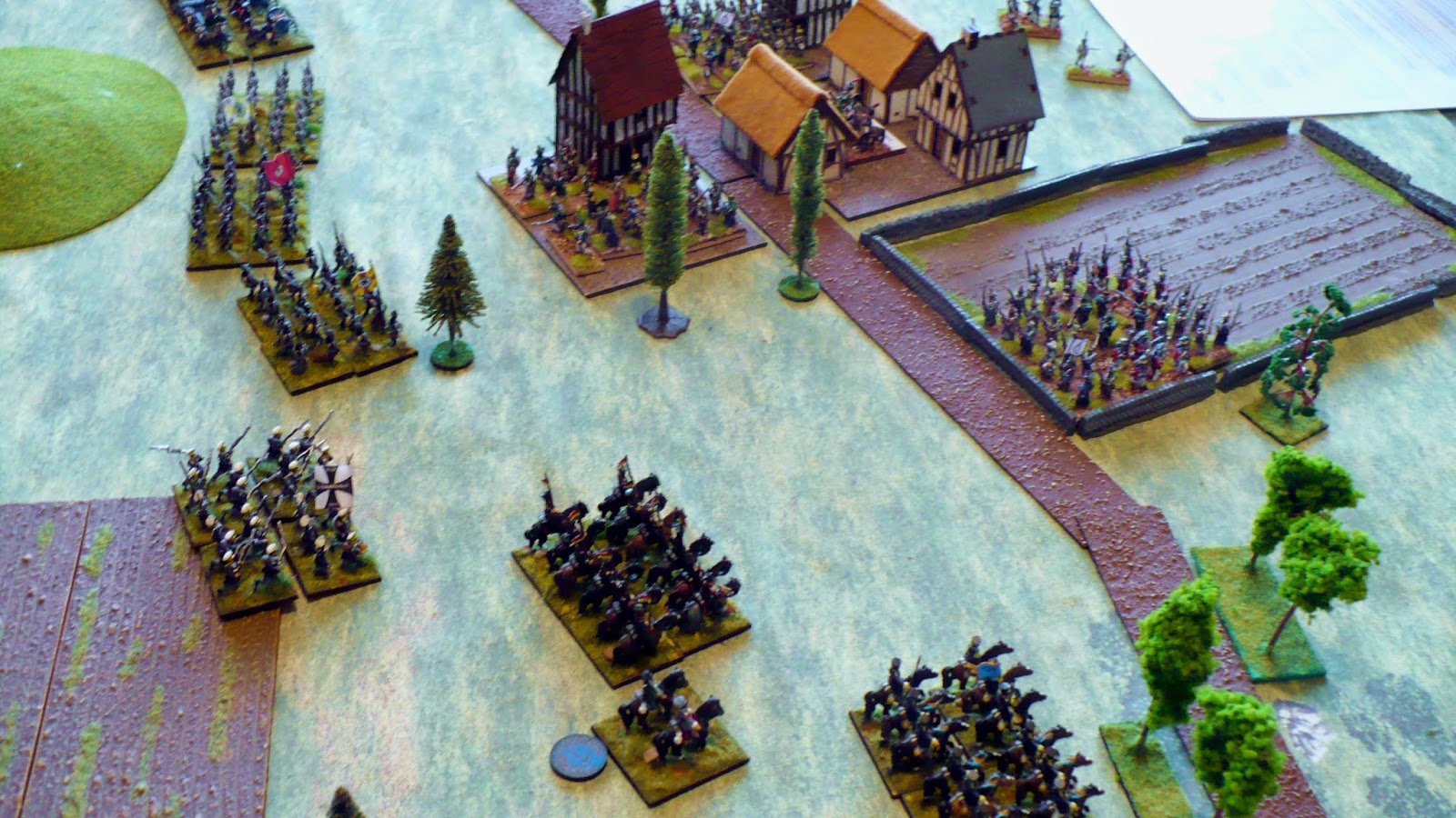 A highlight was a lowly unit of Scots skirmishing bowmen shooting to Rout a unit of English Superior Knights (!!!!!) as they rolled 2 dice 3 times getting 2 hits each time causing 3 Cohesion tests on Knights which they promptly failed three times despite attention of a General.