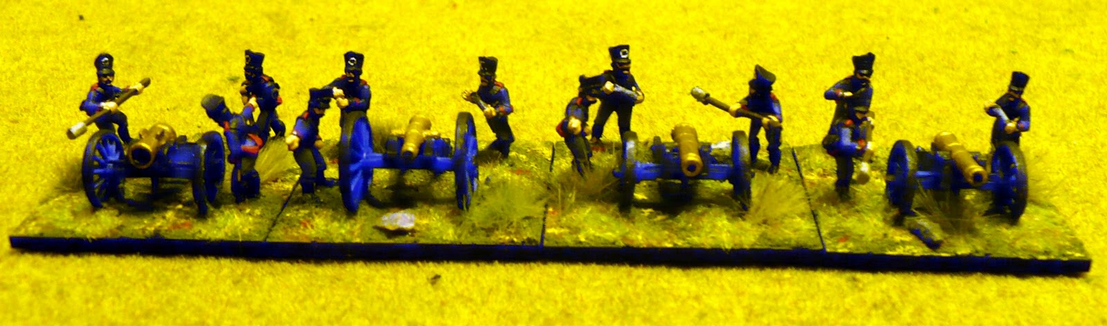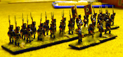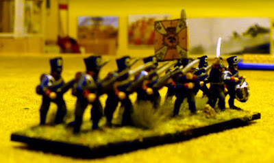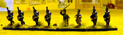 Played a Lasalle 'army builder' game at mine versus Stephen tonight using my Prussians against his mean Young Guard Division. Quite dense terrain table made for very interesting encounter especially when the French off-table reserve arrived on its second turn (uncanny how he gets them to arrive with low rolls !). I used the on-table Cavalry Abteilung (so as my recently completed Landwehr Cavalry units could be fielded). Lots of maneuvering on both sides with my East Prussian Battalion taking the central town as a French Infantry brigade occupied the adjacent woodlands. My Cavalry Brigade moved to my left wing from central deployment to try to counter the early arriving French mounted Brigade. French 'Grand Battery' in center eventually blew my foot Artillery to bits opening a hole that mounted and foot were poised to exploit.