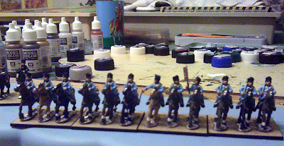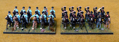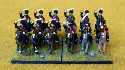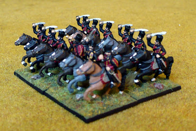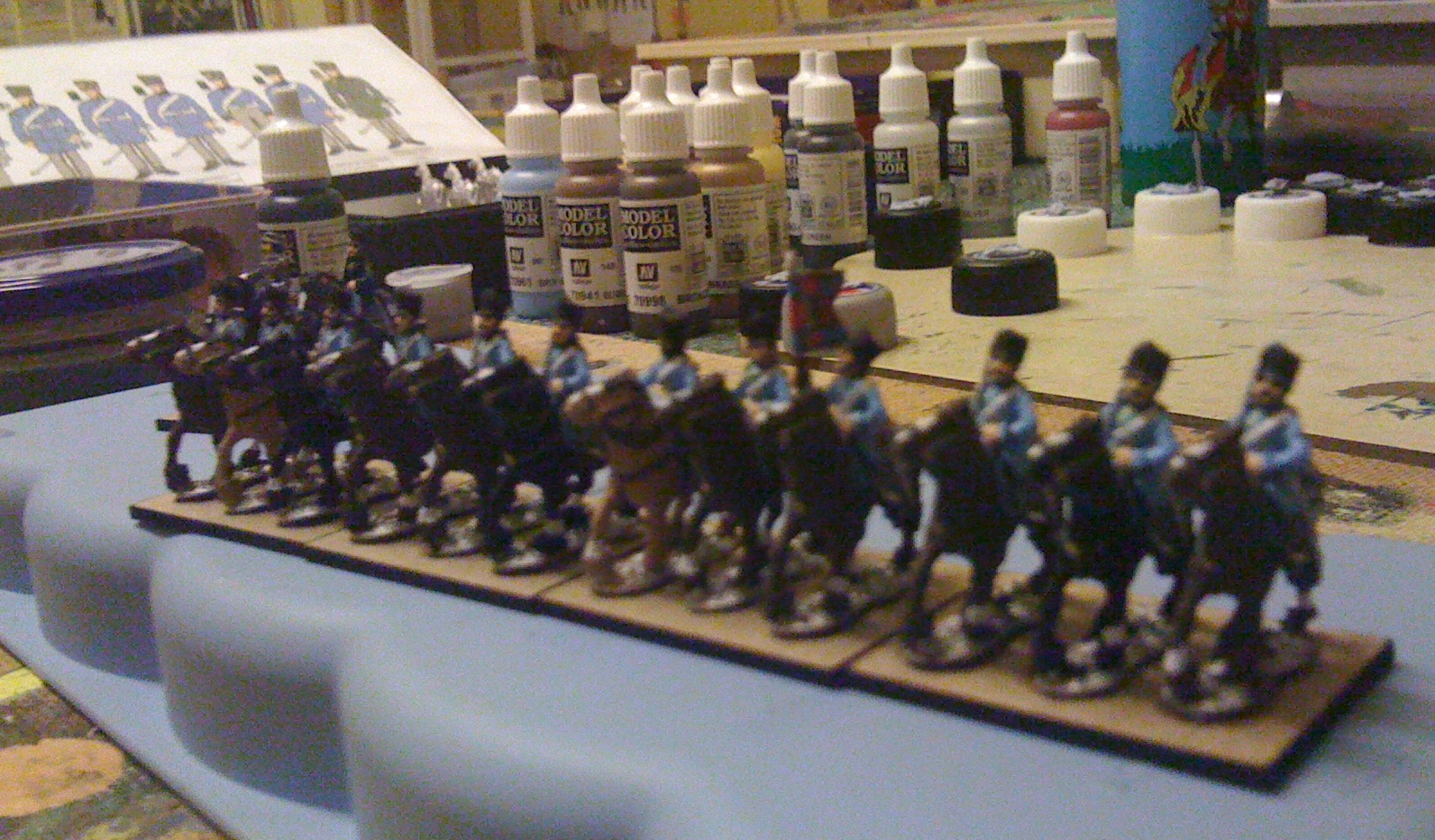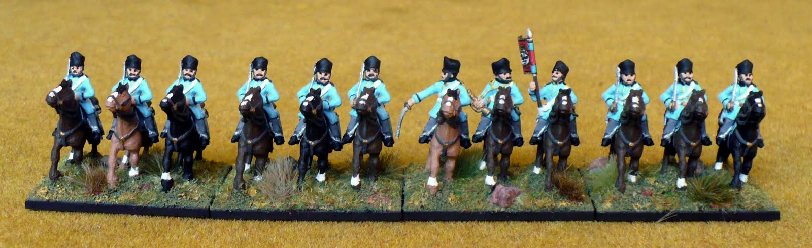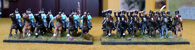 Lasalle game today with Stephen using my Prussians against his Young Guard. French were attackers but with rain and mud their chance of success fairly minimal (as their eight turns barely allowed them to reach my set up zone even in march column) no complaints on Prussian side ! still an interesting game with French having 4 batteries of Artillery (2 x 3 guns batteries with reserve unit) and Prussians having 5 on table Cavalry units (3 Landwehr 1 Dragoon & 1 Hussar). French Artillery fairly pounded my center blasting my Foot artillery and Line Infantry unit. Draw in end mud slowed all progress.
