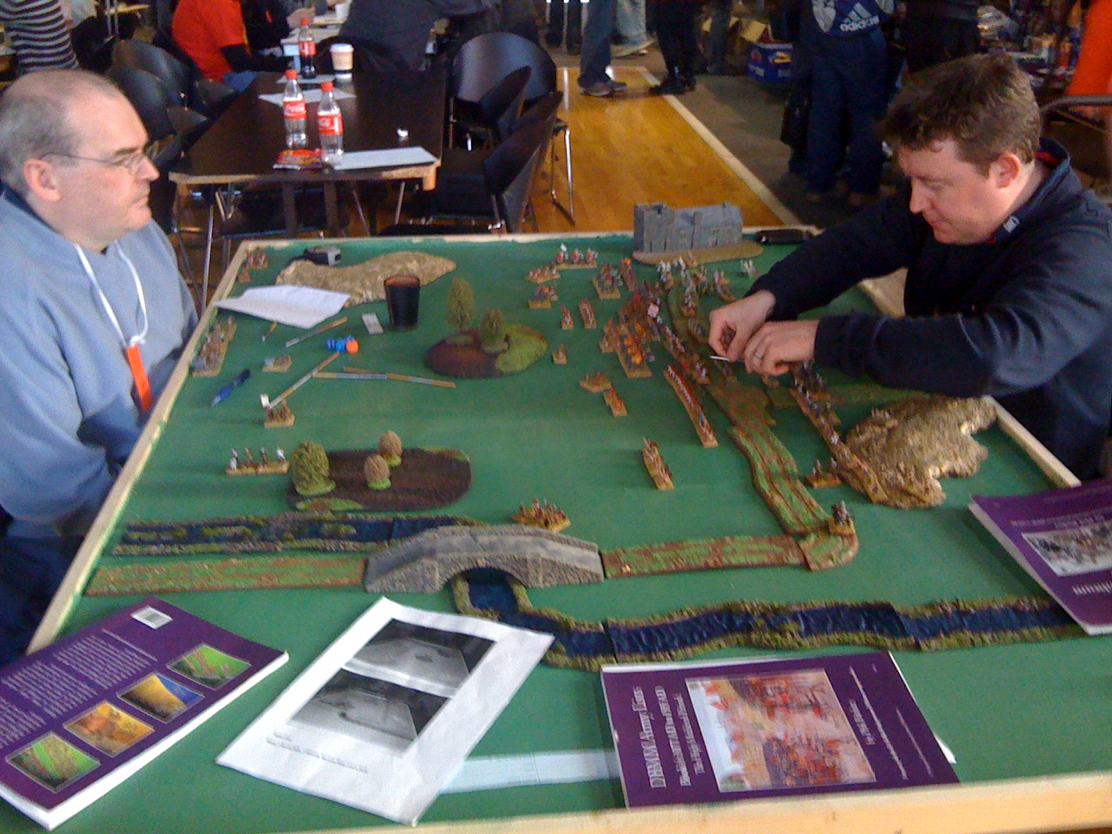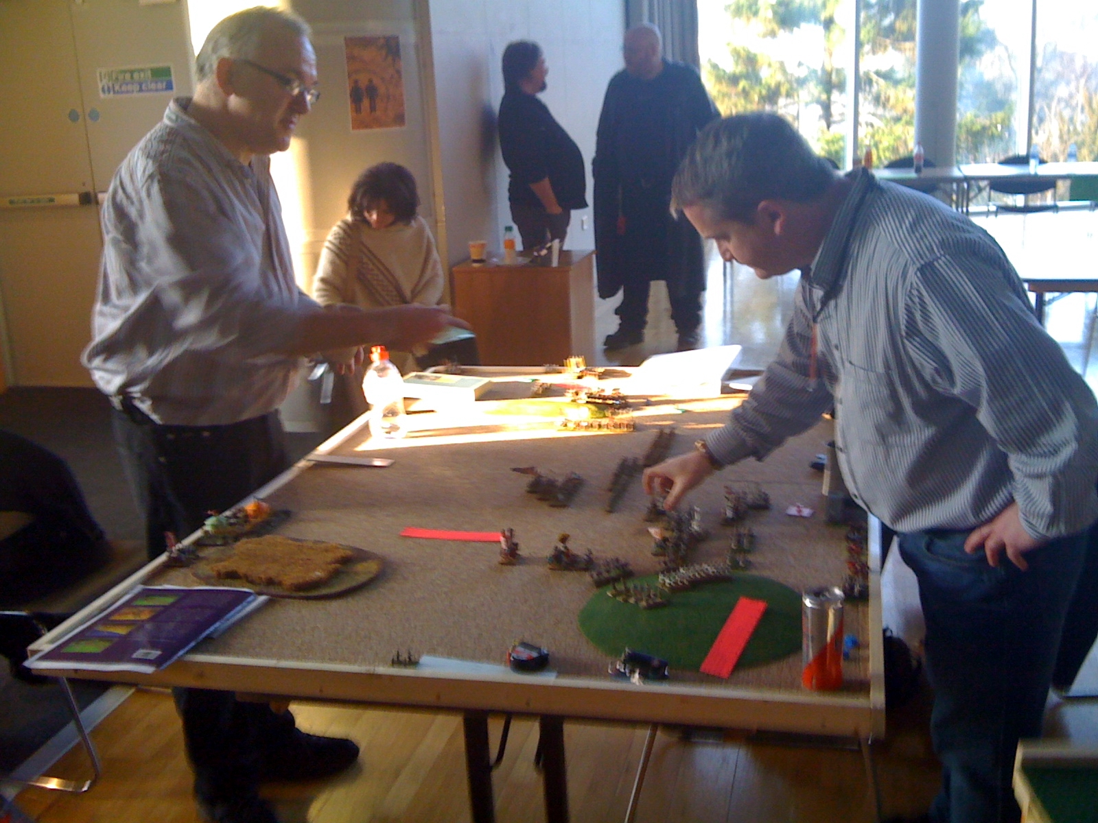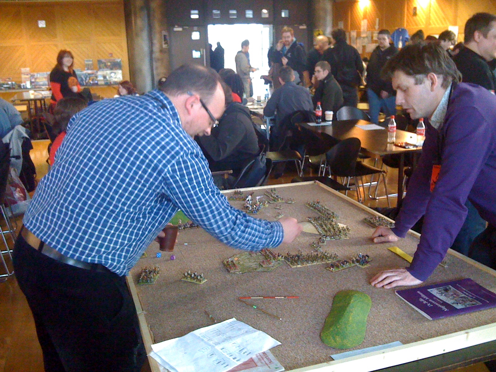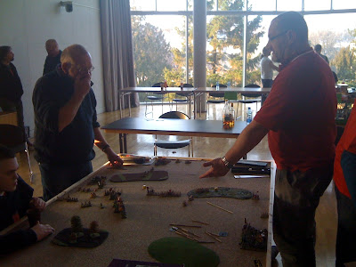 Jan 'Van the Man' Embden snapping one of his figures in half as Nik 'Race you to the bottom' Gaukroger watches bemused in a battle of strangest names encounter (Note Dave 'The Don' Houston in background seemingly playing on wrong table)