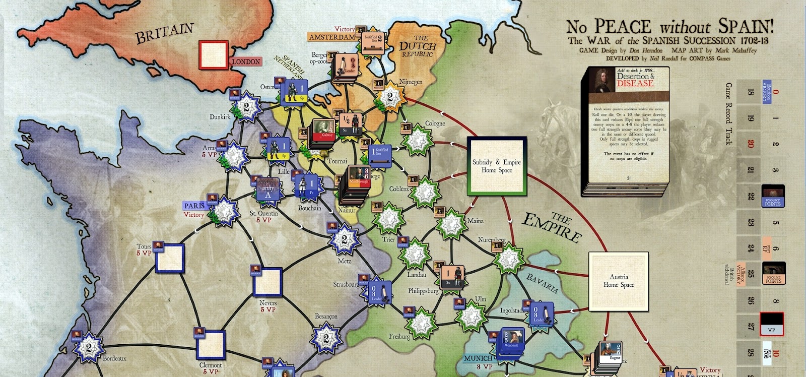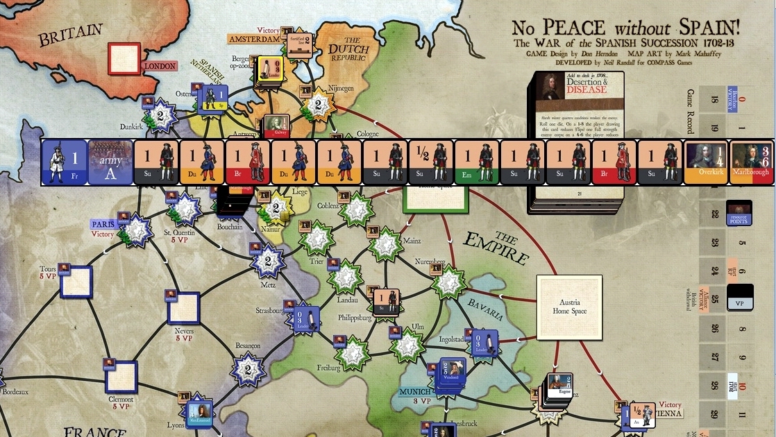 No Peace Without Spain board game via Vassal showing overall at start of 1704