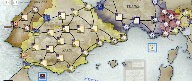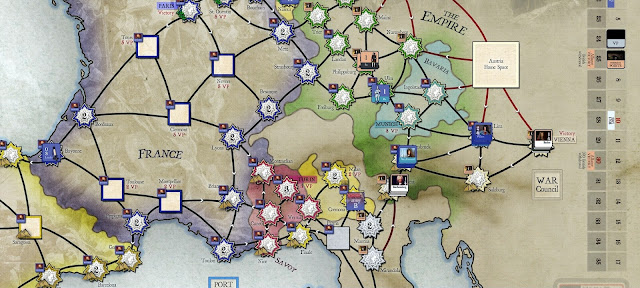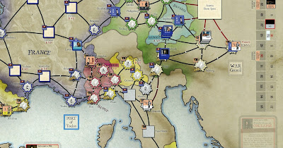 Allies had minor gains in Italy taking Naples for 2VPs (off set by Bourbon gains in Spain). A Savoian force did venture into France taking Lyons but were soon ousted and the city restored to Bourbon control.