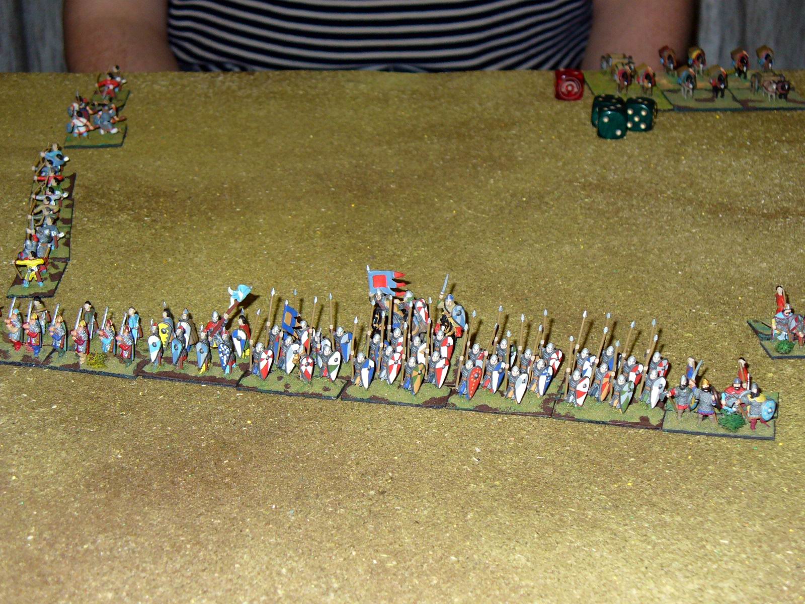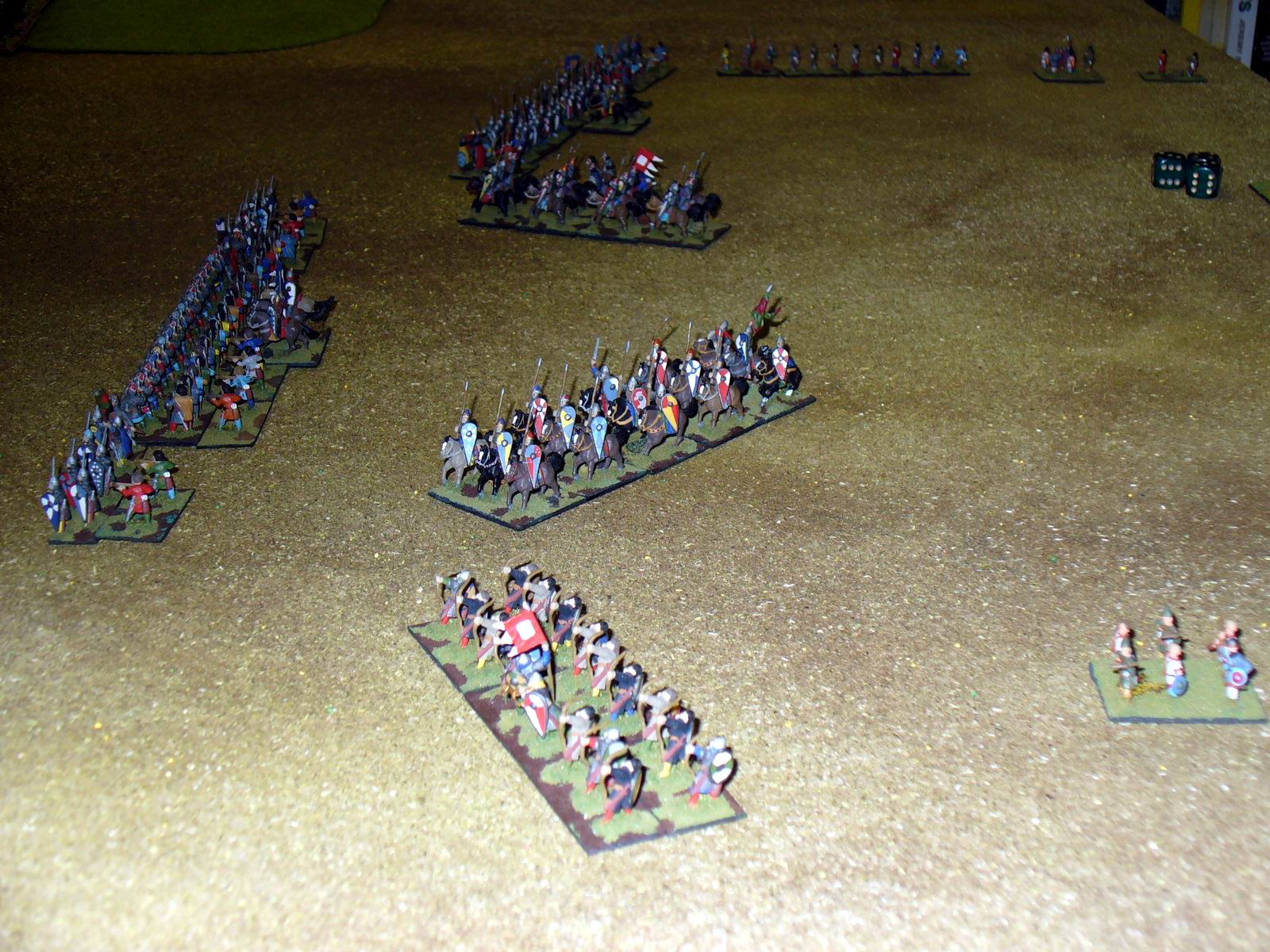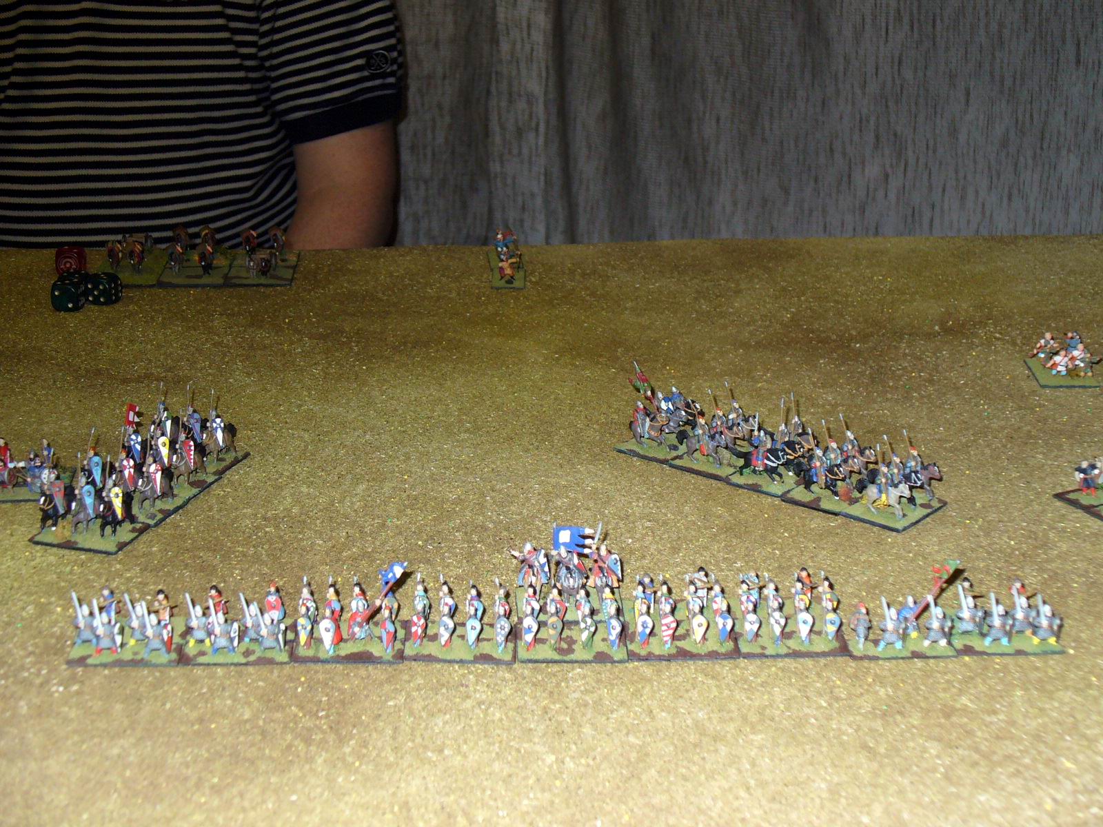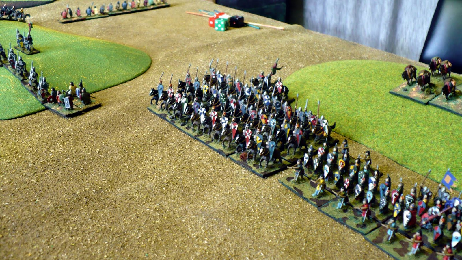 Played game today vs Stephen using my Eastern Franks (circa 1090AD) vs his Sicilian Norman of same time frame. A good historical match-up of two Irregular armies (not often we play such). Yet another good game (Dbmm is certainly fun) made great by the fact that my dice rolls were decent for once. My dismounted Swabian Knights (BdO) were able to take a hill held by Arab type Bows and Aux without loss. We both ended up with out KnO fighting enemy SpI and  some enemy Knights with the key outcomes being my killing 2 KnO on 6 vs 1 rolls. The losses incurred were enough when combined with -2ME hit from breaking the Bow Cmd to give me a............................wait for it.......................22-3 WIN !!!!!!!! the first in what seems eons.....................