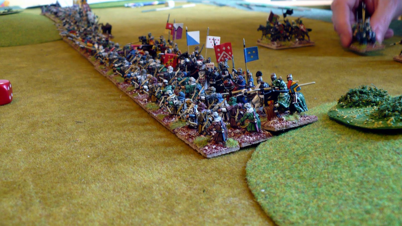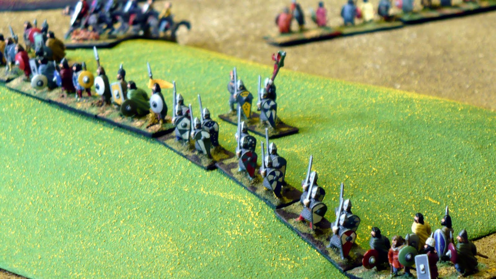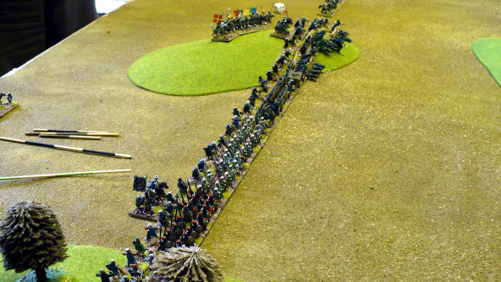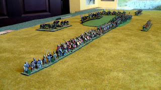 Played game today vs Stephen using my Eastern Franks (circa 1090AD) vs his Sicilian Norman of same time frame. A good historical match-up of two Irregular armies (not often we play such). Yet another good game (Dbmm is certainly fun) made great by the fact that my dice rolls were decent for once. My dismounted Swabian Knights (BdO) were able to take a hill held by Arab type Bows and Aux without loss. We both ended up with out KnO fighting enemy SpI and  some enemy Knights with the key outcomes being my killing 2 KnO on 6 vs 1 rolls. The losses incurred were enough when combined with -2ME hit from breaking the Bow Cmd to give me a............................wait for it.......................22-3 WIN !!!!!!!! the first in what seems eons.....................