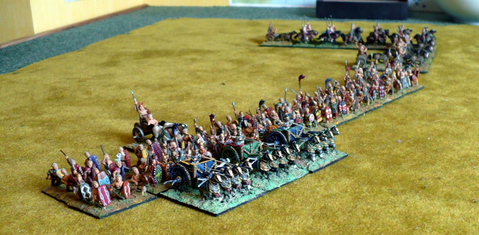 Another (!!) Dbmm game versus Stephen today using Galatians, essentially to use 3 Scythed Chariots he painted up for me (in exchange for some 10mm Tanks). Faced Cathaginan combined arms which managed to generate almost perfect terrain and then I managed to deploy first. Usual frustration in use of Warband as near impossible to get to grips with anything, anywhere, anytime unless on enemy terms (ie flank contacts, uphill in difficult). Numidian Lh and Cartho Cav did for my right flank Cmd allowing them access to rear of my central Cmd of warriors. Left flank Cav/Chariot Cmd held up by more Numidians and Cartho Spears (now viable advancing into contact compared to v1.0). Several new features of version 2 came to notice (Ps now dont QK Warband and Aux must pursue other foot) AuxS very tough still, especially when uphill on wooded hill !!