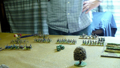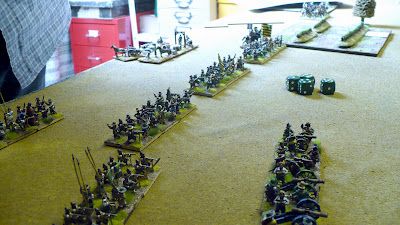 Another game using Die Fighting with our Seven Years War Russian and Prussian armies as Stephens' brother John came along and wanted to see Die Fighting in action. I generated the terrain and the scenario using Command Piquet system which saw fairly standard deployments but with Russians losing 2 units prior to game but Prussians having to deploy first. A very enjoyable game as ever with Ivans running out of dice in the end (rather too many actions attempted as I tried to show John how rules work). Prussians had rather decent commanders (generating some 30+ leader dice and Superior CinC)) but poor old Ivans a rather lamer bunch (a mere 17 leader dice and an Inept CinC) and combined with usual higher Command Divisor (we used 3 for ubermensch vis standard 4 for Ivans) and control over phase cards the Prussians command and control was much more effective (which seemed perfectly fine). John seemed to like the system although same initial comments as ourselves regarding 'bloodless' nature of combat and resource management being key. We allowed Leader dice to be used in Melee Defence and limited losses to maximum of initial value of units. The losses limit is probably enough in fact as one less likely to pile several leader dice into a combat if maximum dice loss one can inflict is thus limited. New Volgodski units managed to survive (mainly due to limited action with Inept sub-commander in charge).