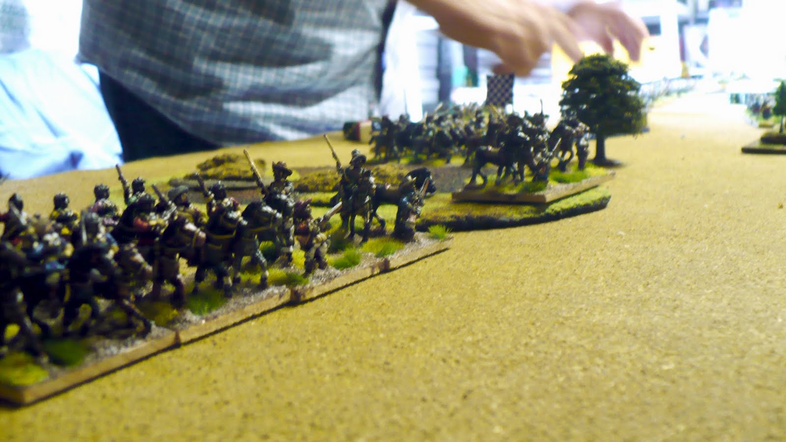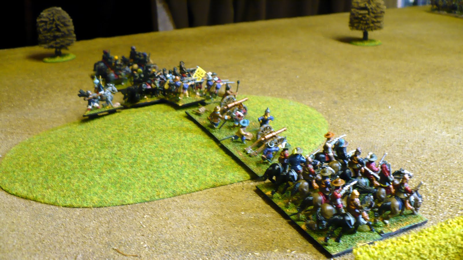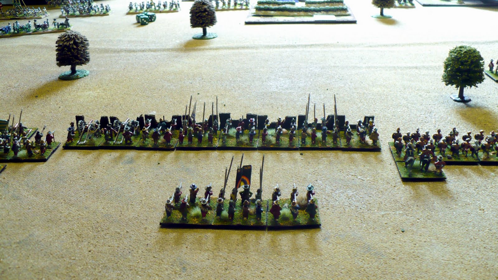 On my right wing I advanced my Tratischer (sword and buckler types) supported by Dragoons and Schutzen (Light Inf) revealing two ambushing units of enemy horse. My Tratischer gloriously charged a Pike & Shot unit (first time I have ever managed to get them into contact in a game !) and trounced it and also saw off a unit of Horse. Their victories were tarnished somewhat though in post match analysis (ie waffling session) as I realised the unit should have had only four bases not the six I fielded (got confused over order of march number vis strength....at least that's my excuse). The Dragoons were destroyed but supporting Schutzen had inflicted damage and fragmented another unit of French Horse.