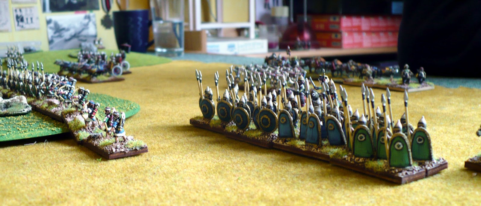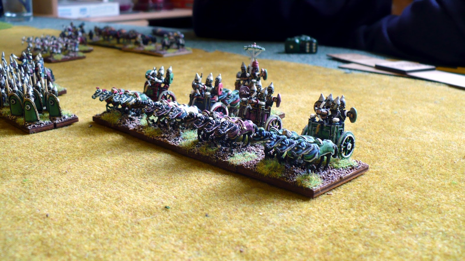 Game was decided when my faster Chariots (KnF) failed in massed charge against slower Hittite versions (KnO) and then broke when their General fell to a 6:1 !! The delayed Command arrived just as this happened but too late to save the day. I then in all or nothing charged my huge line of Spearmen off the hill into the Hittite foot and Gascon mounted causing some damage but not enough to turn things around. Great game once more with again two rather handsome armies. Sort of unique feel to these 'Biblical' type armies.
