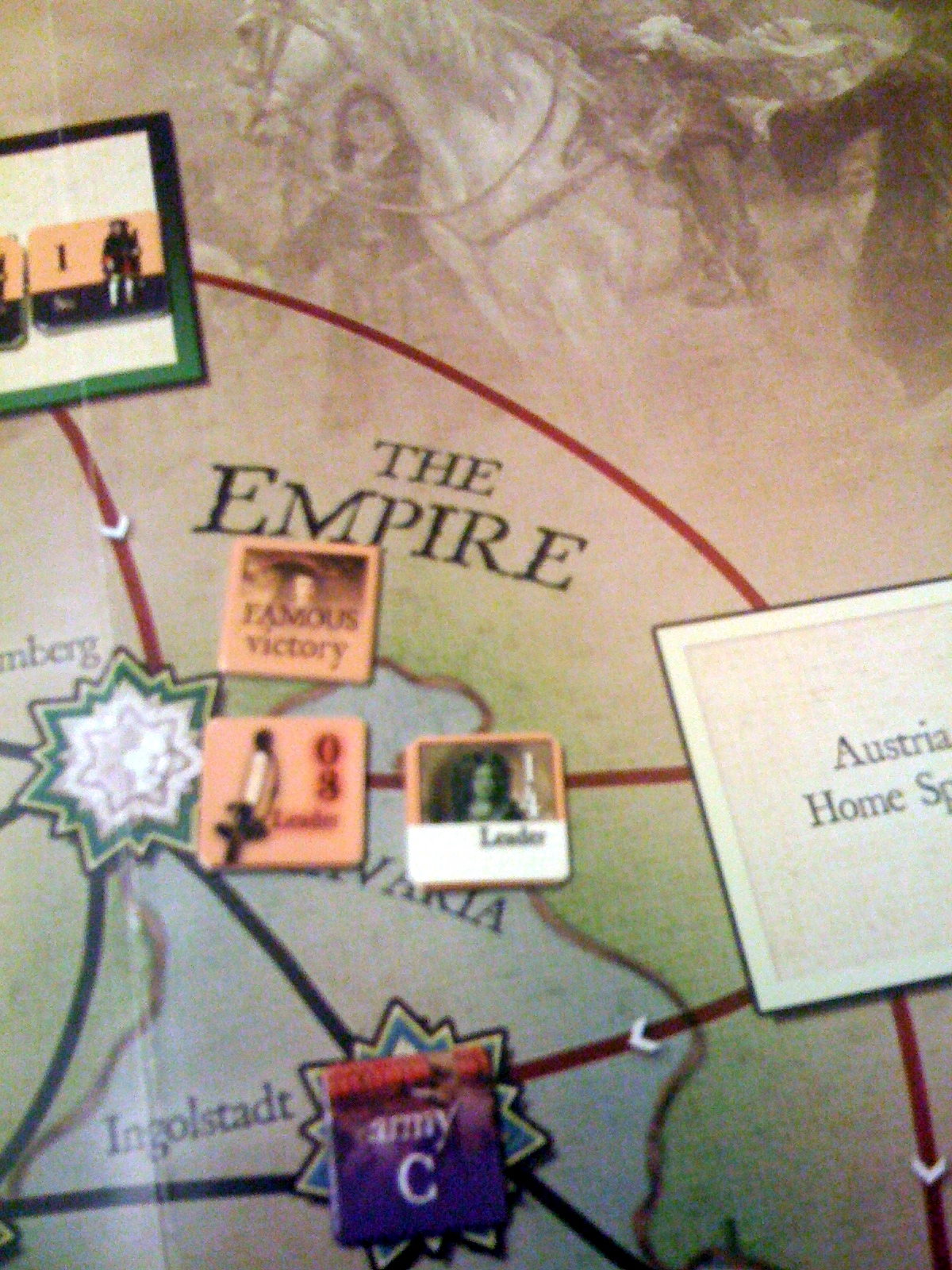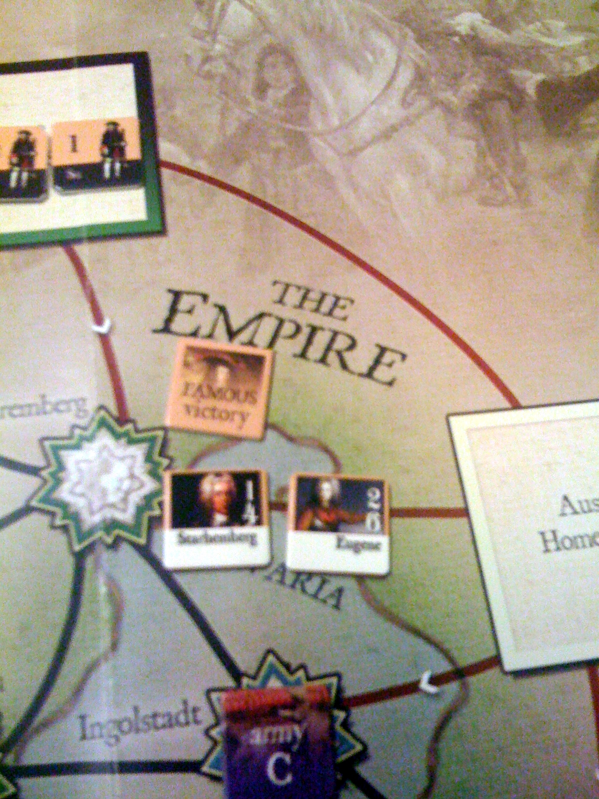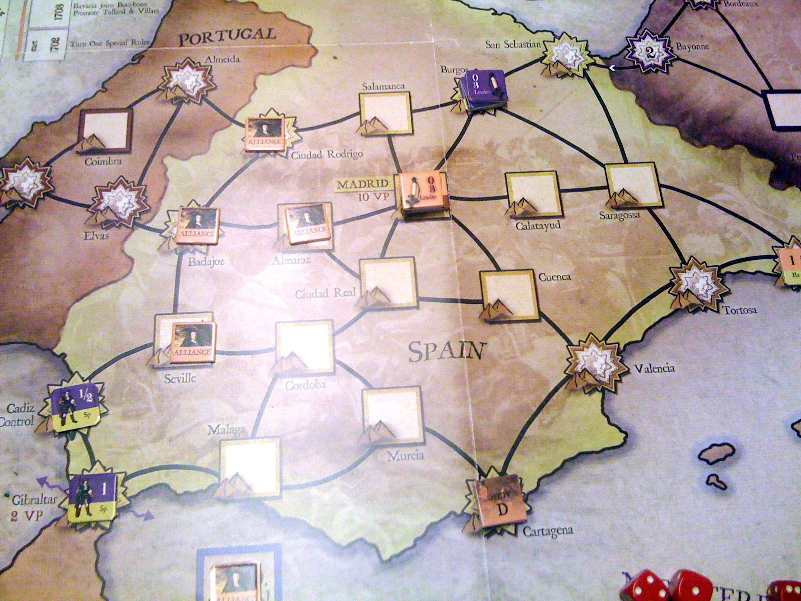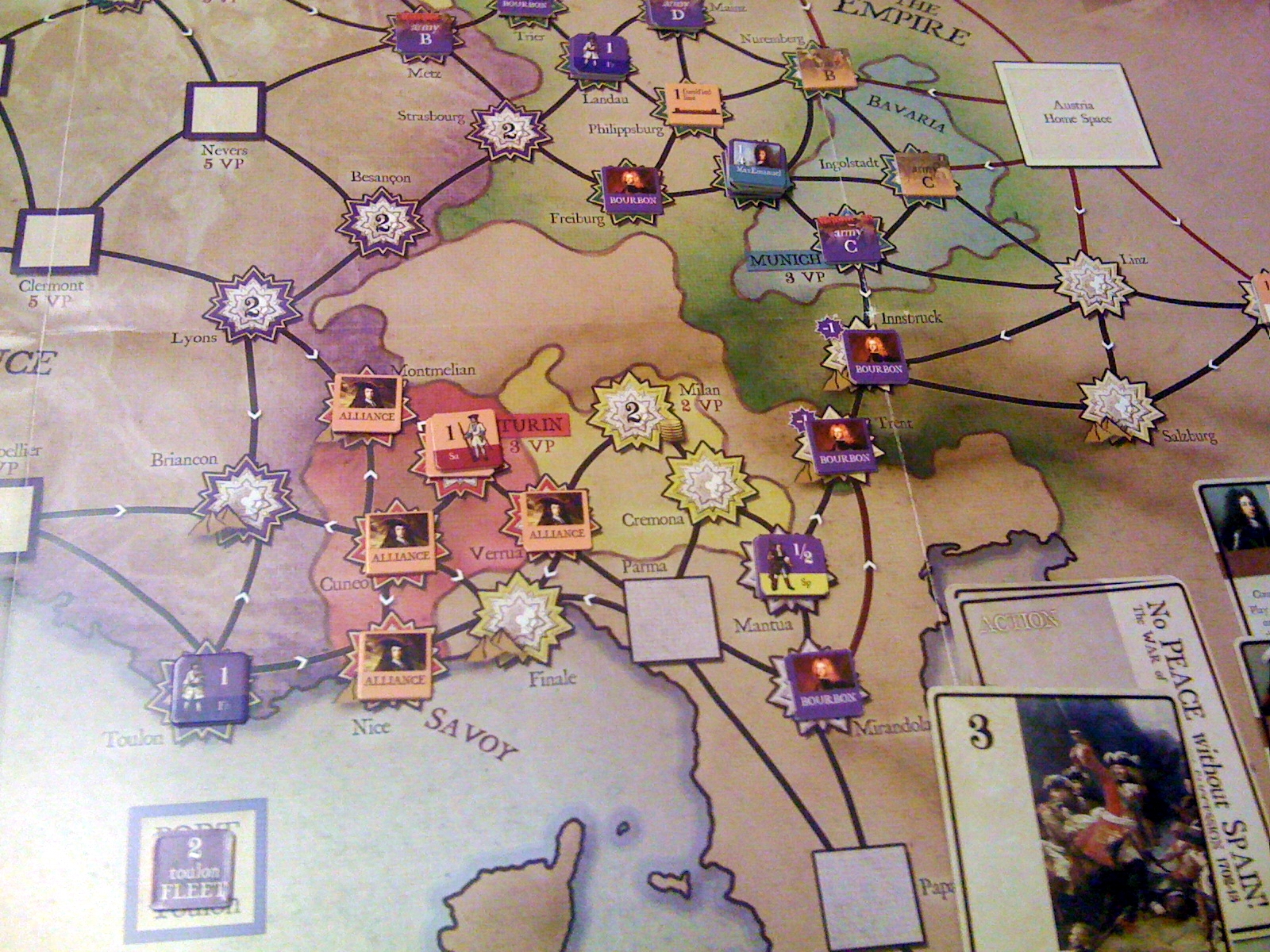 Played a few more turns of this intriguing and enjoyable game. Bourbons holding fast in Flanders against a strong force lead by Marlborough (who just cant bring anyone to battle and has been poor at laying siege). Spain however pretty much under Alliance control with Habsburg Spainish having come into play along with Portugal. Savoy being fickle sods they are have also changed sides to Alliance. Eugene in and around Bavaria has had on and off running battles with Vendome with both trading success and losses. However in 1708 Eugene (with side kick Stahremburg) have just managed to gain a Famous Victory (first in game) at Nuremburg over Elector but with both Eugene and Stahremburg both dying (ie roll 12 on 2D6) in process !! This will give Vendome's army a definite target in up coming year.