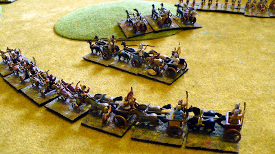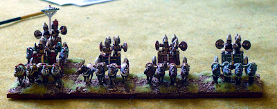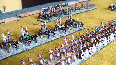 Played another DBMM game (we seem to be a on a roll with this again) today at Stephens. Used a nice historical match-up with my 'have not seen the light of day in ages' Minoans against Stephens' 'aarrgghh bright light ! bright light!' Hittites. Have not used these armies since version 1 of Dbmm and they both need a bit of a re-jig but twas a fine game once more. My Spearmen (with a few bow in support) took up central position on a hill nicely flanked by difficult terrain with my Chariots on their right. My third small Chariot command was delayed off-table (with a maximum 3 commands in this army not a optimum idea maybe). Hittites had 3 Commands with a Gascon ally command. Hittites had usual mix of Warband and Pike Fast foot but were reticent to take my Spearmen on uphill, I of course failed to stay on said hill !!